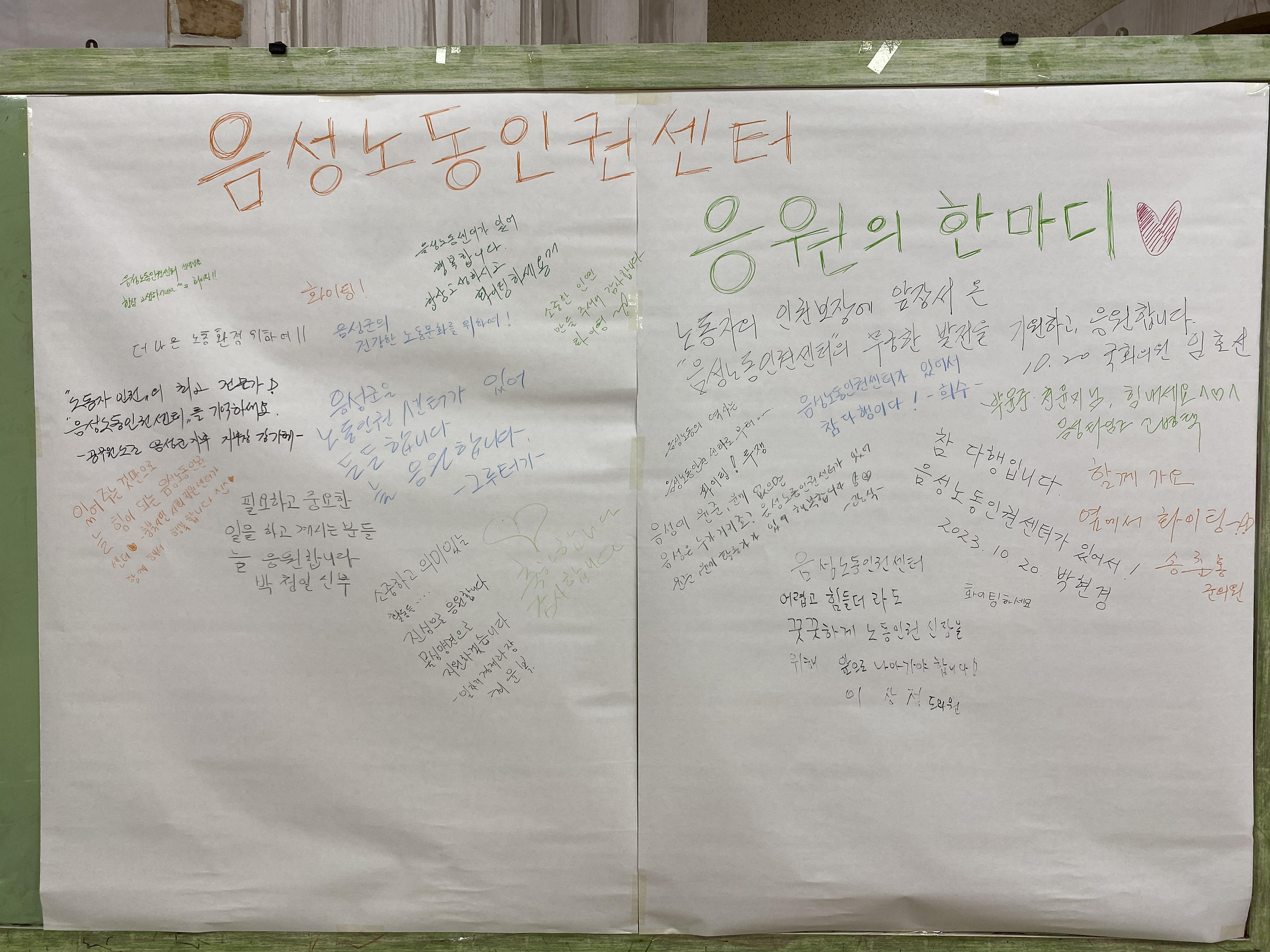 우리는 이곳 음성지역에서, 각자 도생이 아닌, 함께 살아가는 이야기를 계속해서 써내려가겠습니다. 지역에서의 삶을 일구고 있는 우리 자신, 노동자들이 주인공인 이야기를 짓겠습니다. 더불어 우리는 노동자의 사회적 경제적 지위를 높이기 위한 결사체인 노동조합과 함께, 노동자 민중 간의 연대와 연합이 두터워지고 넓어지는 세상을 꿈 꿉니다. 오늘날 일터에서 겪는 부당하고 반인권적인 일들이 개인적인 곤경으로 치부되지 않도록 상담, 교육, 정책, 소모임, 소책자 발행, 노동조합 조직 등 다양한 활동을 통해 연대의 씨실과 날실을 엮겠습니다. 나아가 노조법 2,3조 개정이 조속히 국회에서 이루어지도록 지역에서 계속해서 목소리 내고 행동하겠습니다. 우리의 손을 잡아주셔서 진심으로 감사합니다. "노동인권을 위하여, 노조할 권리 쟁취하자!"