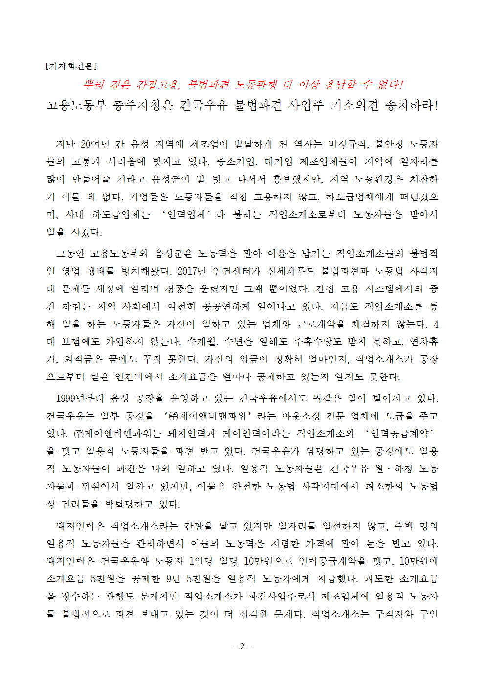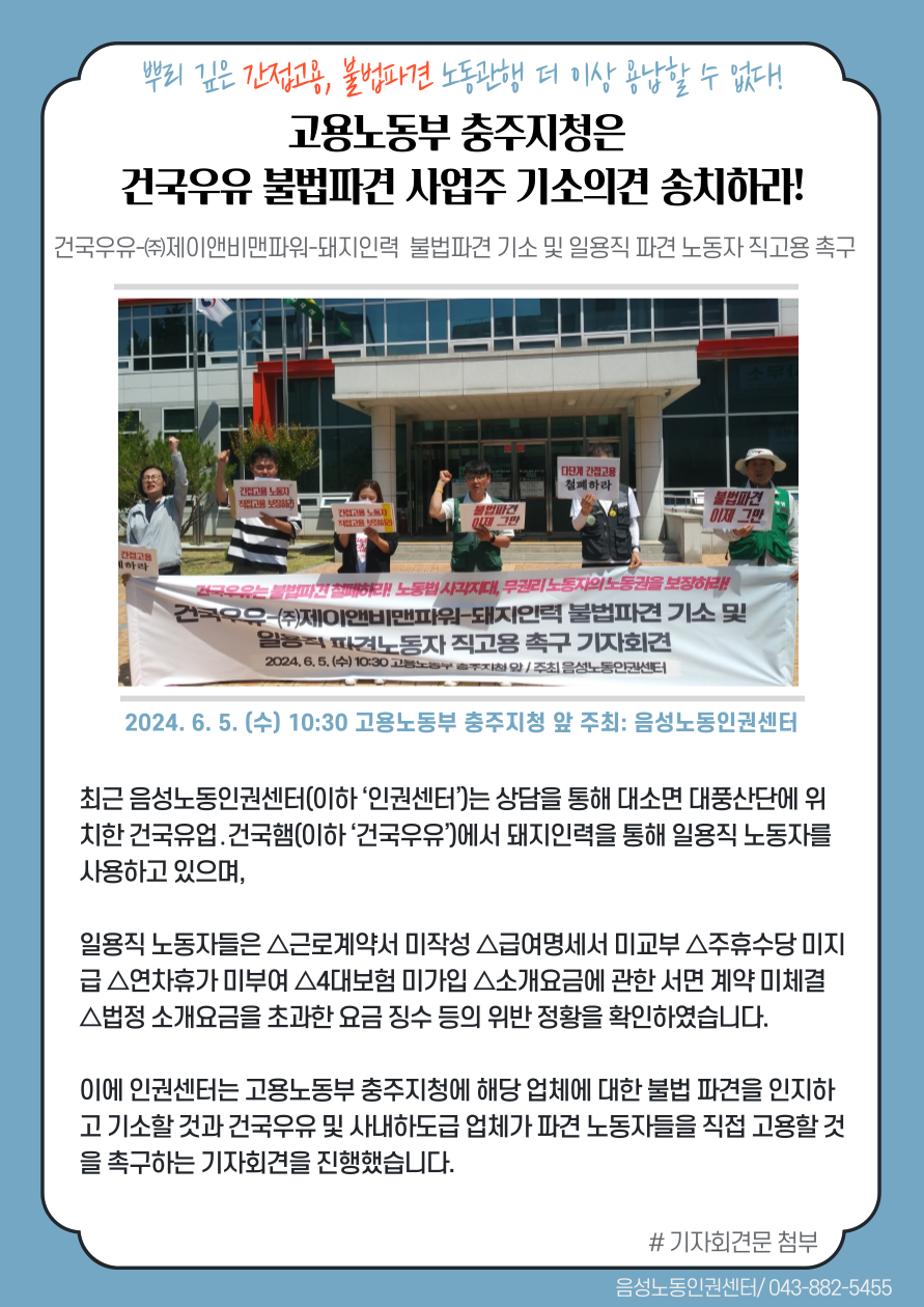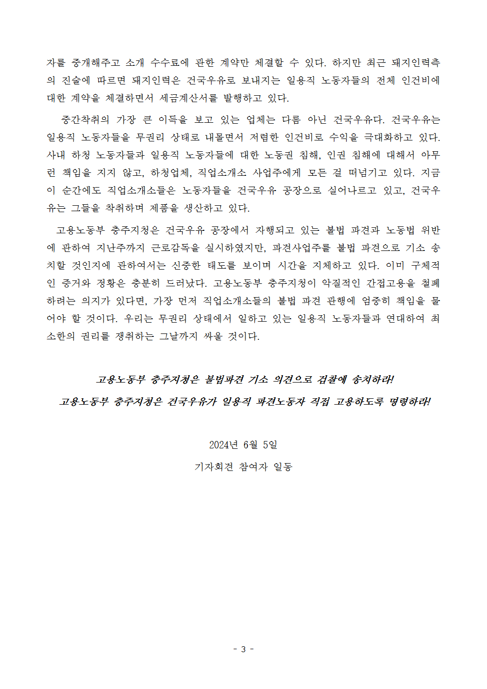 [기자회견문] 뿌리 깊은 간접고용, 불법파견 노동관행 더 이상 용납할 수 없다! 고용노동부 충주지청은 건국우유 불법파견 사업주 기소의견 송치하라!(2024.6.5.)