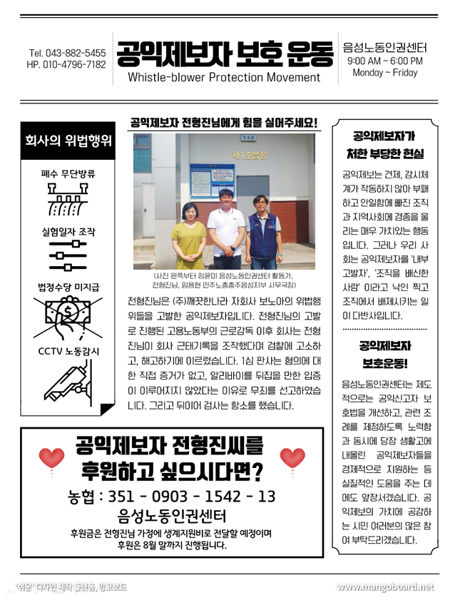 음성노동인권센터가 "공익제보자 보호운동"을 시작합니다! 그 첫번째 활동은 음성지역 공익제보자들이 처한 현실을 알리고 실질적인 도움을 드리는 것입니다. 이후 공익신고자 보호법 및 관련 조례 등 제도적 현황을 살펴보고 변화를 이끌어 내는 활동을 개진해 나갈 계획입니다!