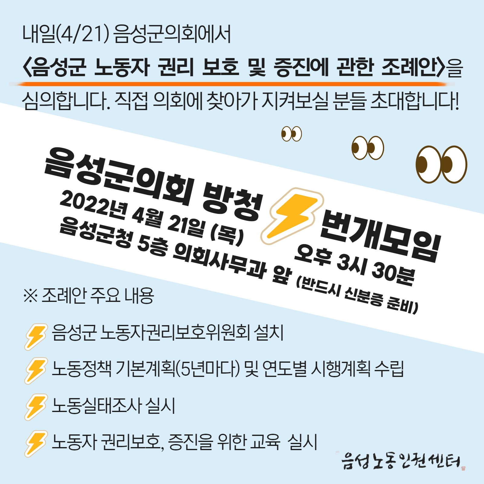 내일 음성군의회가 <음성군 노동자 권리 보호 및 증진에 관한 조례안>을 심의합니다. 제대로 논의하고 의결하는지 두 눈 똑똑히 뜨고 지켜보실 분들 군청에서 모입시다~!