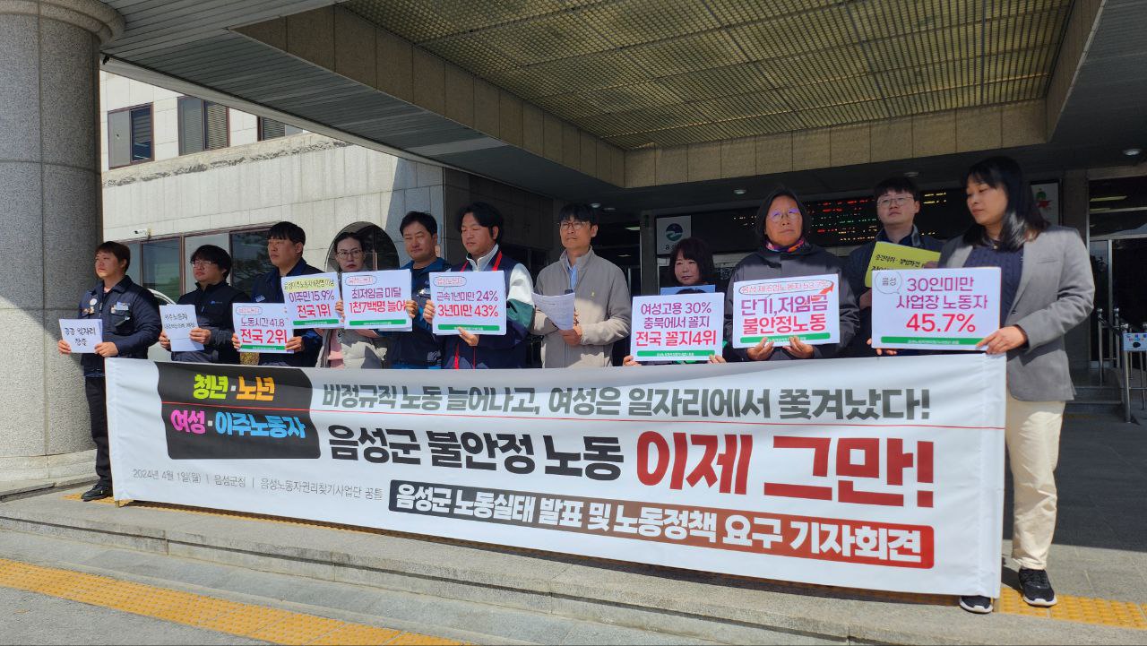 음성군은 높은 고용률을 자랑하며 2024년 23,163명의 일자리를 만들겠다고 발표했다. 2023년 기준 음성지역에 취업한 종사자 수는 88,237명이고 이중 제조업 종사자가 절반에 육박한다. 음성지역 임금노동자 규모는 매년 증가하여 2023년 기준으로 6만 7천 명에 이르고 있다. 문제는 일자리 질이다. 비정규직 비중은 해마다 증가하여 31.3%에 달하고 있다. 노동시간은 전국 지자체에서 2번째로 길다. 최저임금에 미달하는 노동자는 계속 증가하고 있고, 특히 전년 대비 1,700명이나 증가해 5천 명이 넘는 노동자가 최저임금 미만의 임금으로 살아가고 있다. 이들 대부분은 30인 미만 작은 사업장 노동자들이다. 전국에서 가장 많은 이주민이 살고 있고, 도내 가장 많은 이주노동자가 일하고 있는 음성군에서 이주노동자들의 노동권은 더 이상 미룰 수 없는 과제다. 이주노동자들은 제조업과 건설현장에서 가장 어렵고 힘든 일을 감당하지만 가장 기본적인 노동법상 권리에서 배제되고 있다. 2023년부터 2024년 현재까지 음성노동인권센터 상담 활동 보고에 따르면 임금체불이 끊임없이 발생하고 있으며, 비정규직, 하청노동자의 해고 상담이 작년 연말을 경과하며 폭발적으로 증가하고 있다. 한편 음성지역 여성 노동자의 비율은 매년 감소하고 있고 2023년 29.8%로 충북에서 가장 낮았다. 여성고용률은 전국 지자체 중에서 4번째로 낮고, 전국 상황과 다르게 남초 현상이 두드러지게 나타나고 있다. 음성 지역 일자리에서 가장 먼저 여성이 밀려나고 있고, 많은 여성들이 음성군을 떠나고 있는 것이다.
