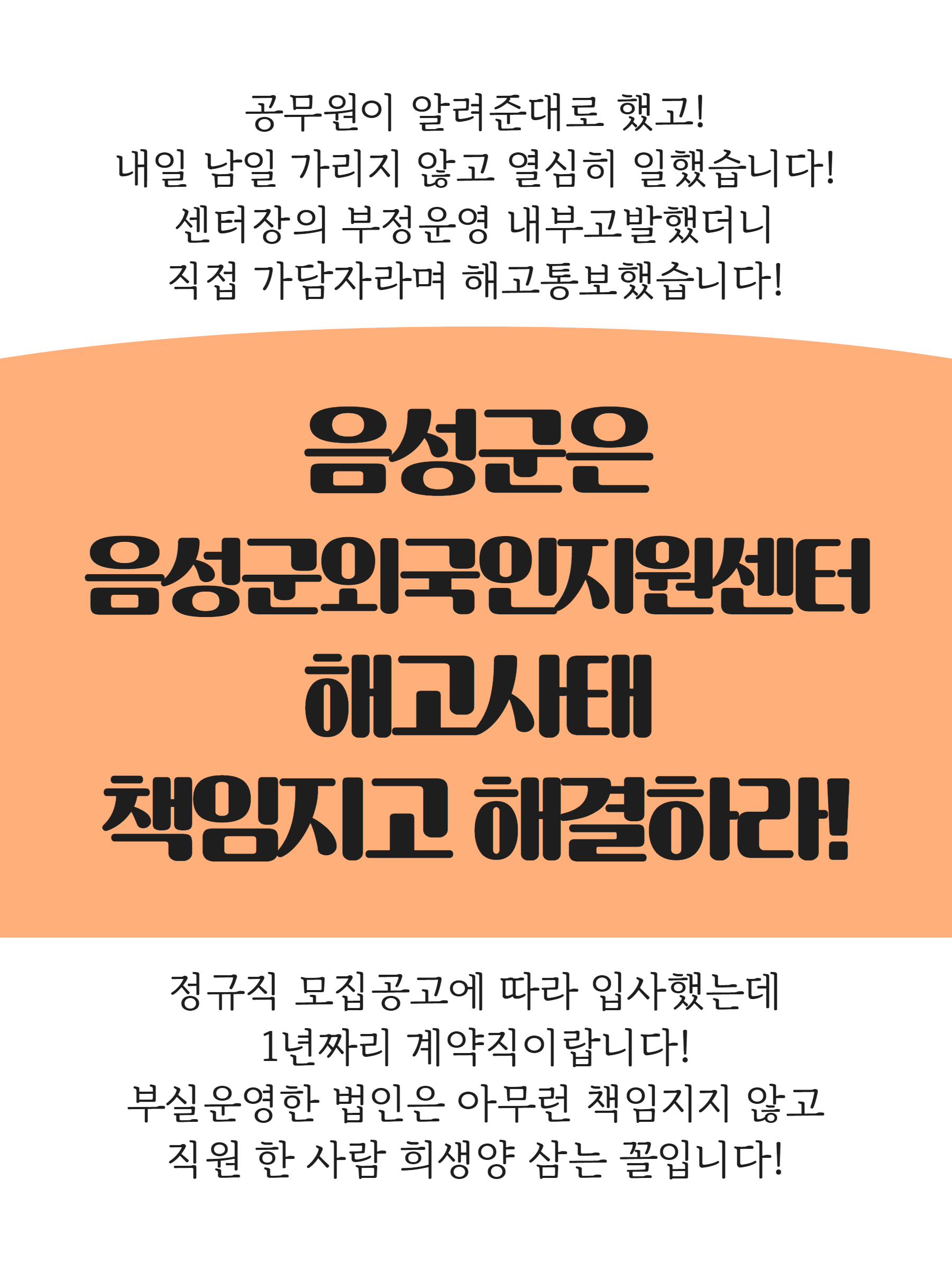 외국인지원센터의 부정운영 실태의 1차적인 책임은 음성군에게 있다. 음성군은 공정하고 합리적인 기준으로 수탁기관을 선정해야하고, 수탁기관이 이주민들에게 적정한 서비스를 제공할 수 있도록 지도·관리해야한다. 그뿐만 아니라 수탁기관에서 근무하는 노동자들의 근무여건과 노동인권이 보장되도록 노력해야한다. 그러나 이번 사태에서 음성군은 ‘정상화 운영을 촉구한다’고 보도자료를 발표한 것 외에 어떤 책임을 지고 있는가? 중간사용자인 법인은 어떤 책임을 지고 있는가? 왜 최선을 다해 센터를 운영하려고 노력했던 직원 A씨만 누명을 쓴 채 해고당해야 하는가? 왜 아무도 책임지지 않는 구조 속에서 노동자가 불이익을 감내해야하는가?