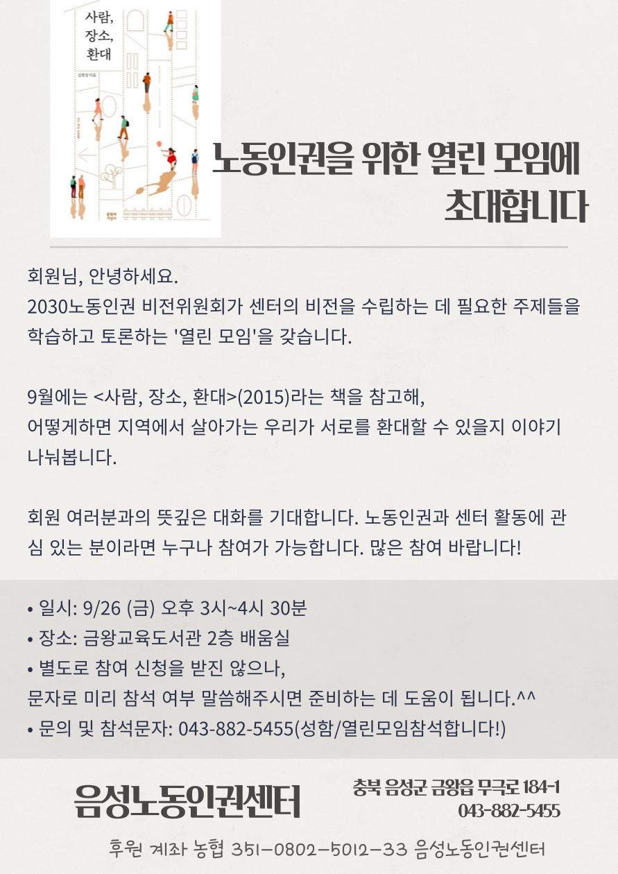 9월 모임에서는 김현경의 <사람, 장소, 환대>(2015)라는 책을 참고해, 어떻게하면 지역에서 살아가는 우리가 서로를 환대할 수 있을지 이야기 나눠봅니다.(책을 꼭 읽고 오지 않으셔도 됩니다!) 회원 여러분과의 뜻깊은 대화를 기대합니다. 많은 참여 바랍니다!