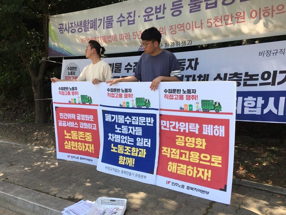 우리가 흔히 "환경미화원"으로 알고 있는 "생활폐기물 수집운반 노동자"들은 군청 소속 직원이 아닌 민간업체 소속 직원들입니다. 생활폐기물 처리와 같은 공공부문사업이 민간위탁으로 지난 20여년간 운영되면서 많은 문제들이 발생했습니다. 민간기업은 공공성에서 비롯한 사회적 책임, 윤리의식을 망각하고 "이윤 극대화"라는 한 가지 목표 하에 노동자를 착취하고 공무원과 유착하며 불법과 비리를 저질렀습니다. 일례로 금왕읍 일대 생활폐기물을 책임지는 "음성환경"은 언론 보도에도 나왔듯이 "직접노무비" 명목으로 받은 지자체 예산을 중간에서 가로채거나 임의로 사용하였고, 현장 노동자들의 안전, 위생에 대해서는 숱한 요구에도 개선하지 않았습니다.