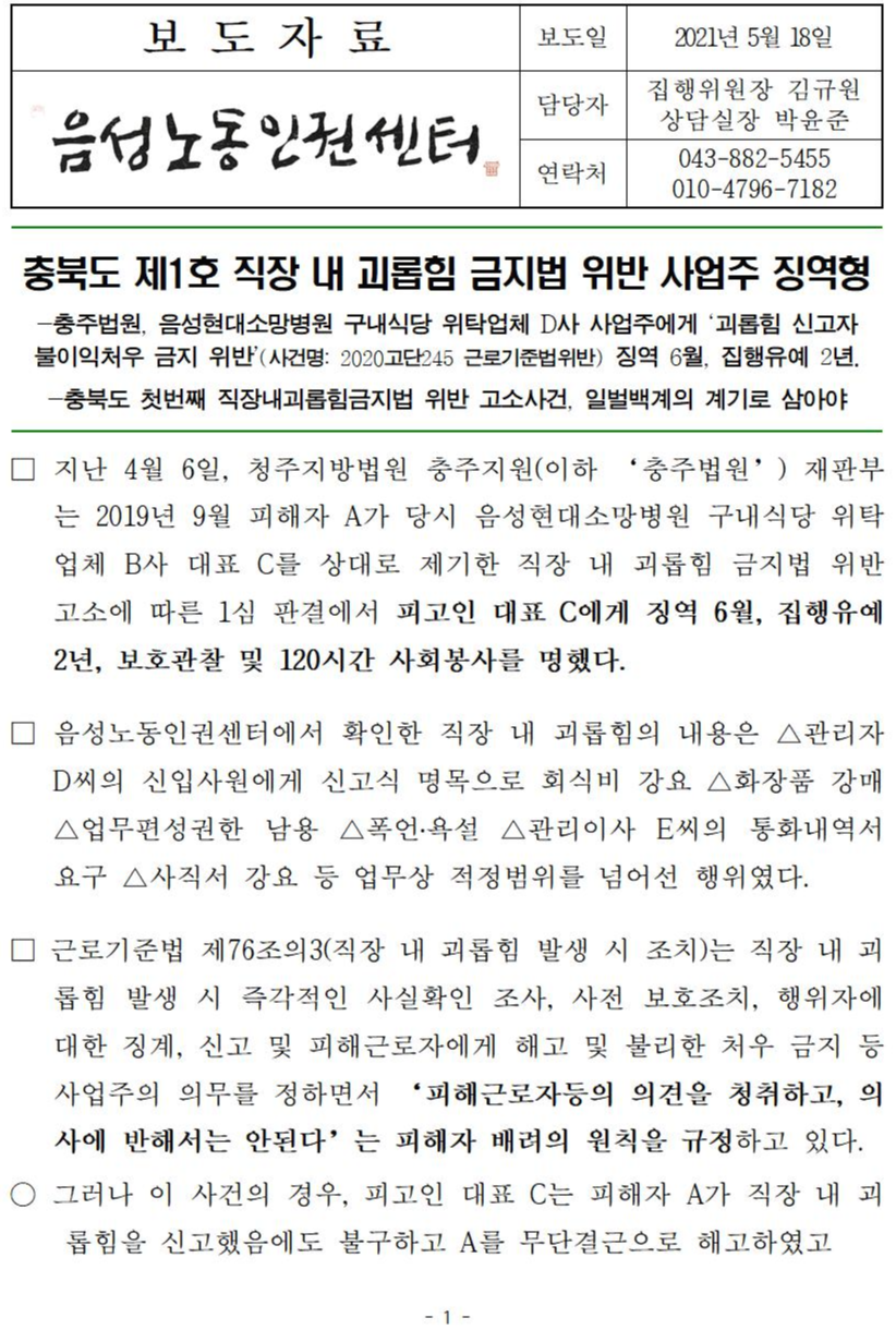 | [기자회견] 음성군외국인지원센터 직원 해고통보 철회 및 고용보장 촉구 (0) | 2021.02.25 |