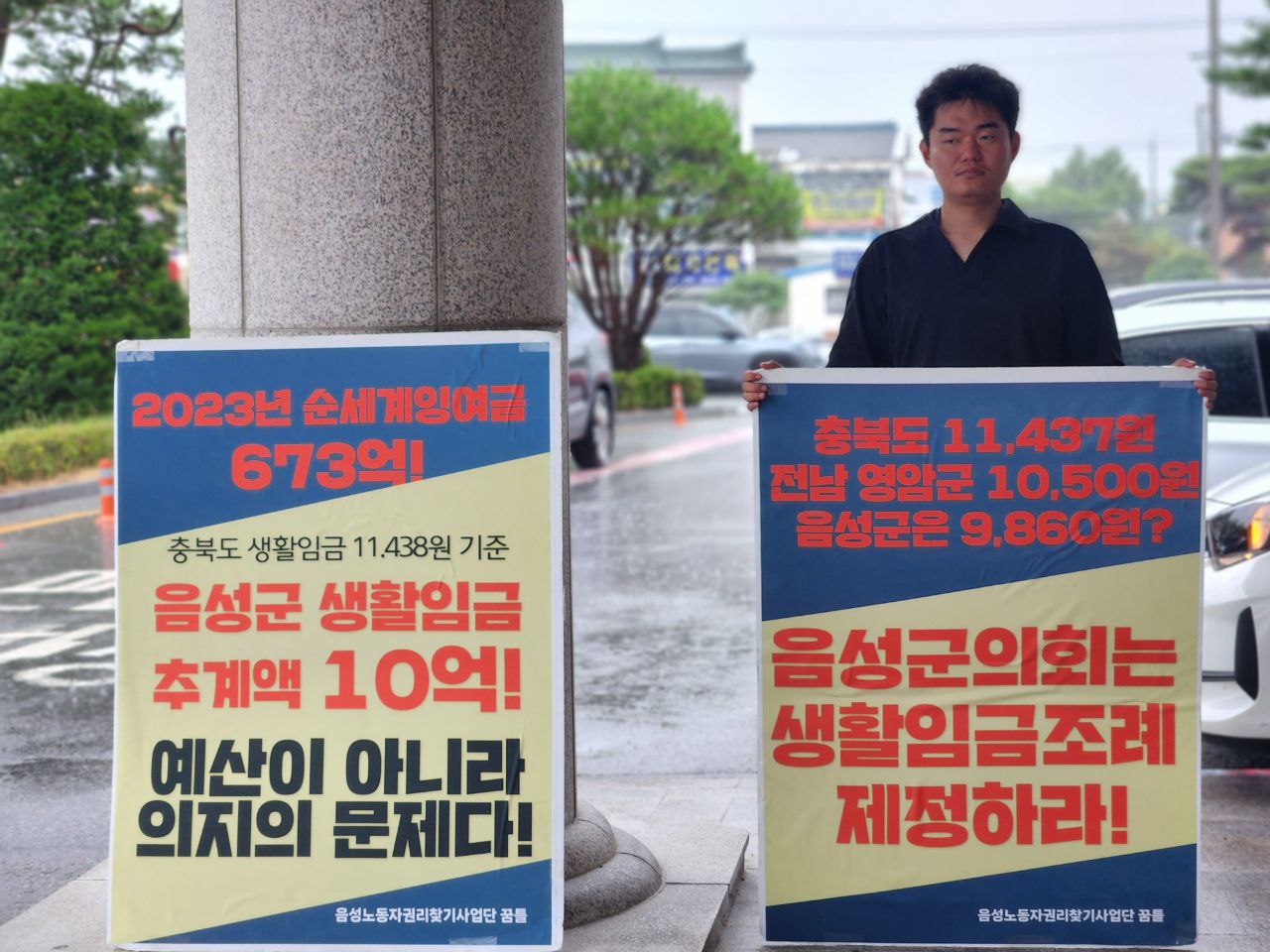 오늘 오전 11시 50분터 음성군청 앞에서 음성군의회의 생활임금조례 제정 촉구 피켓팅 활동에 천윤미 홍보차장, 박성우 상임활동가가 나섰습니다.