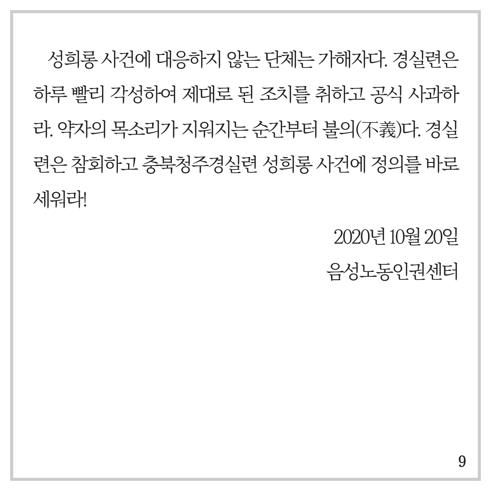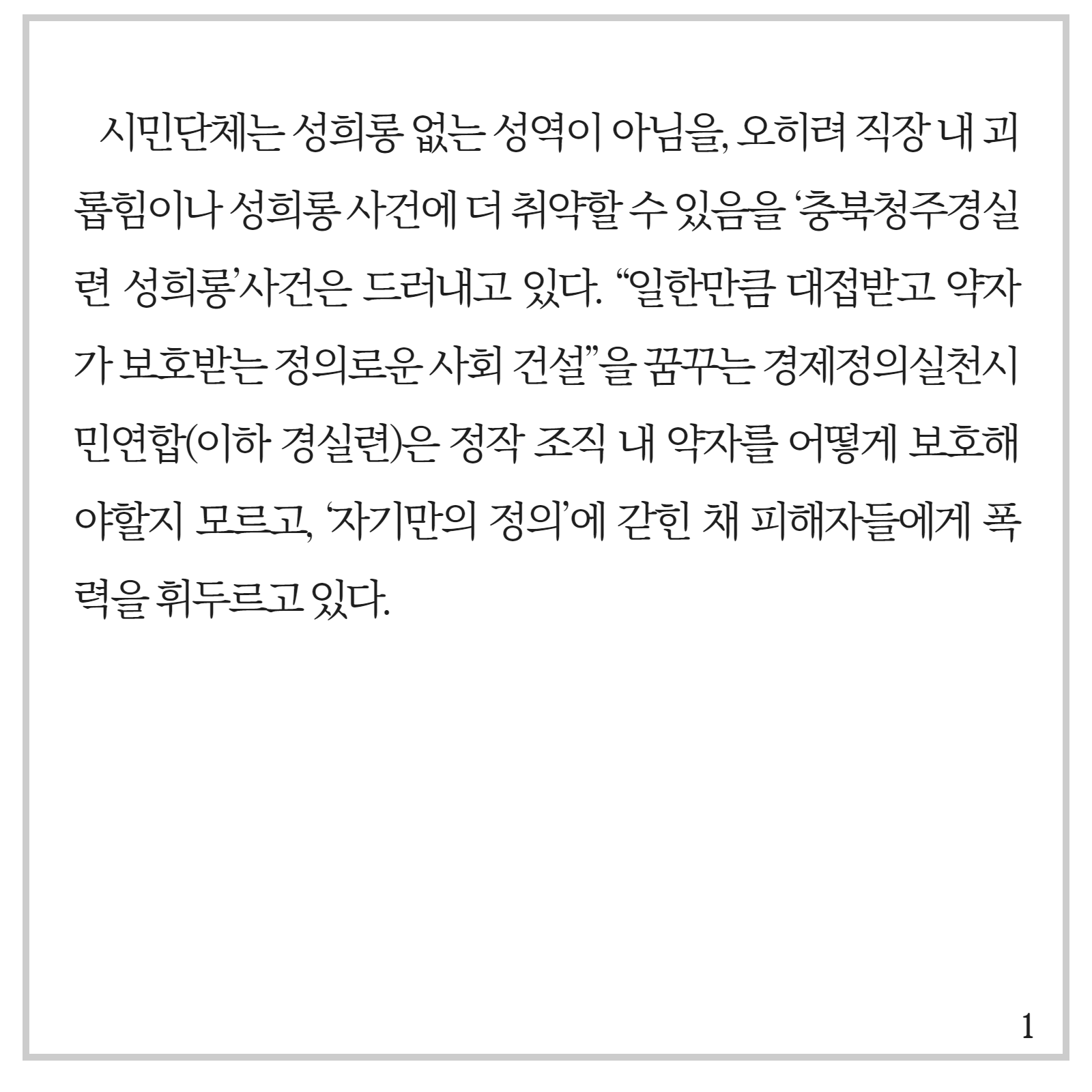 | <성명서>성희롱 사건에 제대로 대응하지 않는 경실련도 가해자다 (0) | 2020.12.02 |