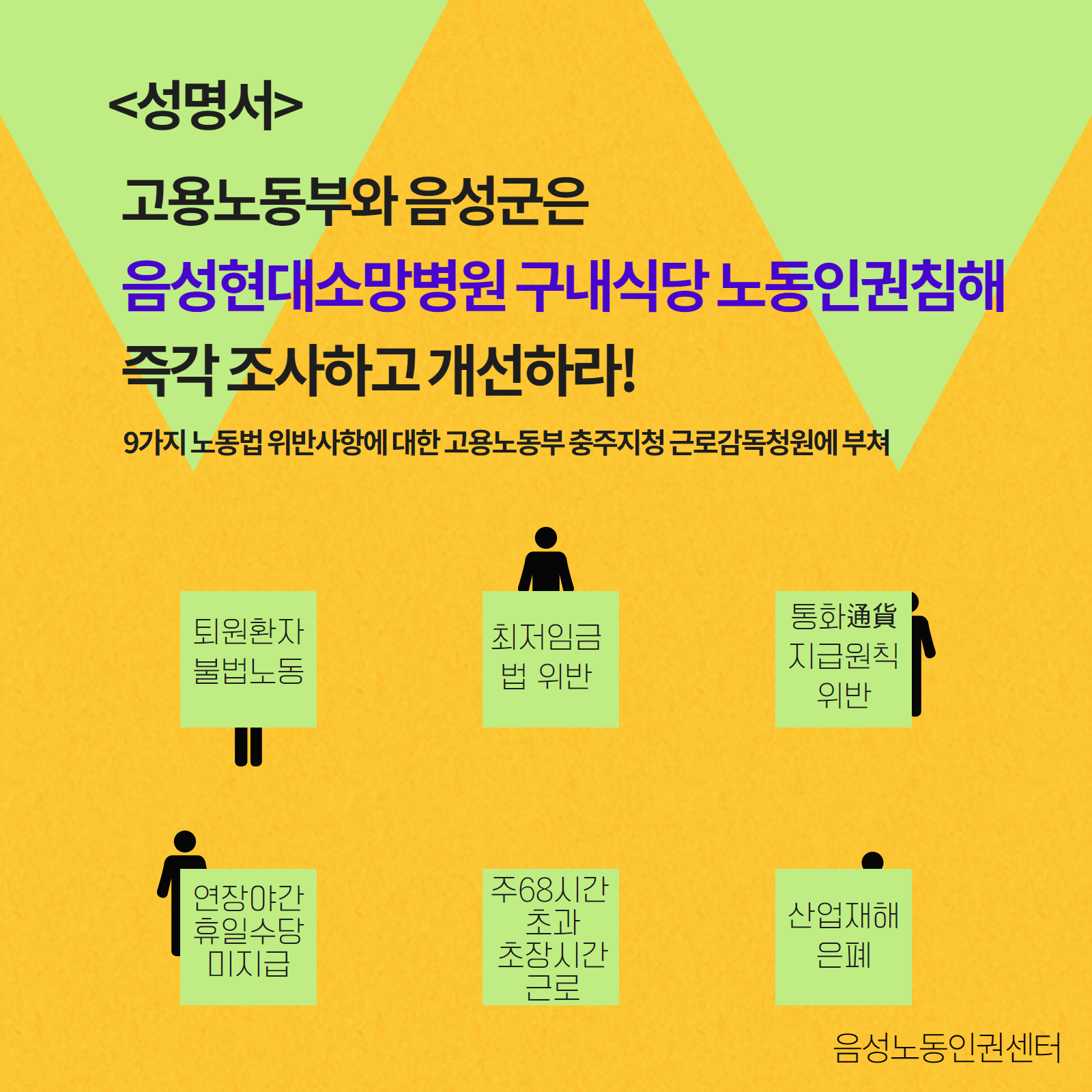 고용노동부와 음성군은 음성현대소망병원 구내식당 노동인권침해 즉각 조사하고 개선하라!