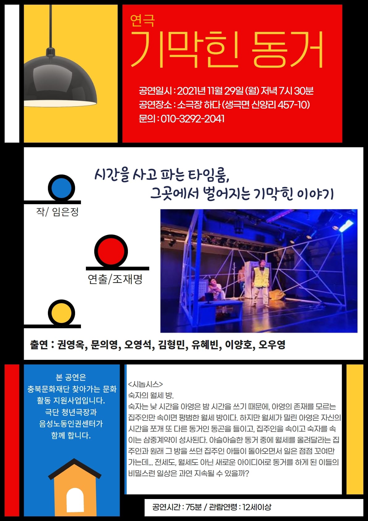 "충북문화재단 찾아가는 문화활동 지원사업"의 일환으로 극단 청년극장, 음성노동인권센터, 소극장하다가 연극 <기막힌 동거>를 준비했습니다. 무료 입장입니다. 많은 분들 오셔서 연극 공연 즐기시면 좋겠습니다.^^