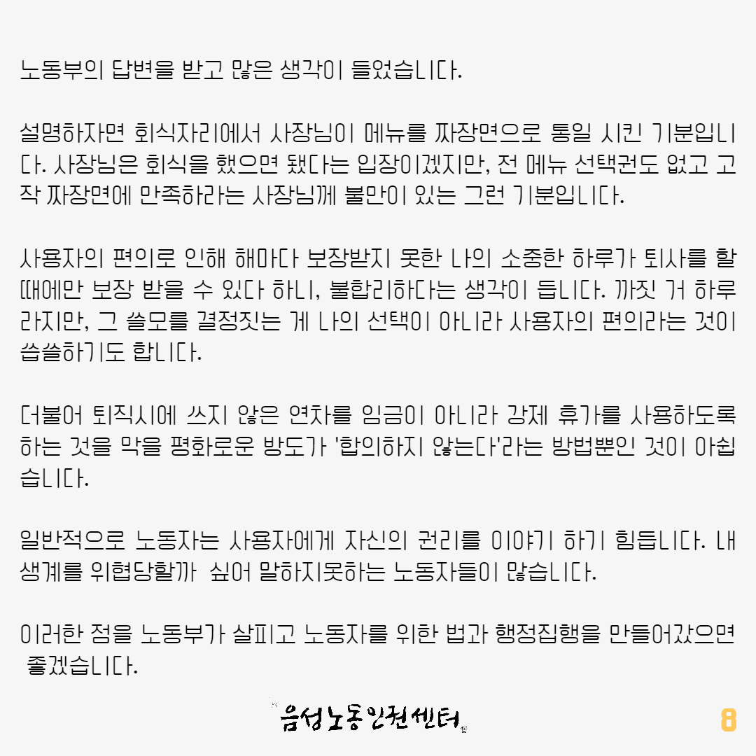 사실 만족스러운 답변은 아니었습니다. 노동부 스스로 원칙을 지키지 않는 문제에 대해 꾸준히 문제제기 하고 바꿀 수 있도록 노력이 필요합니다.