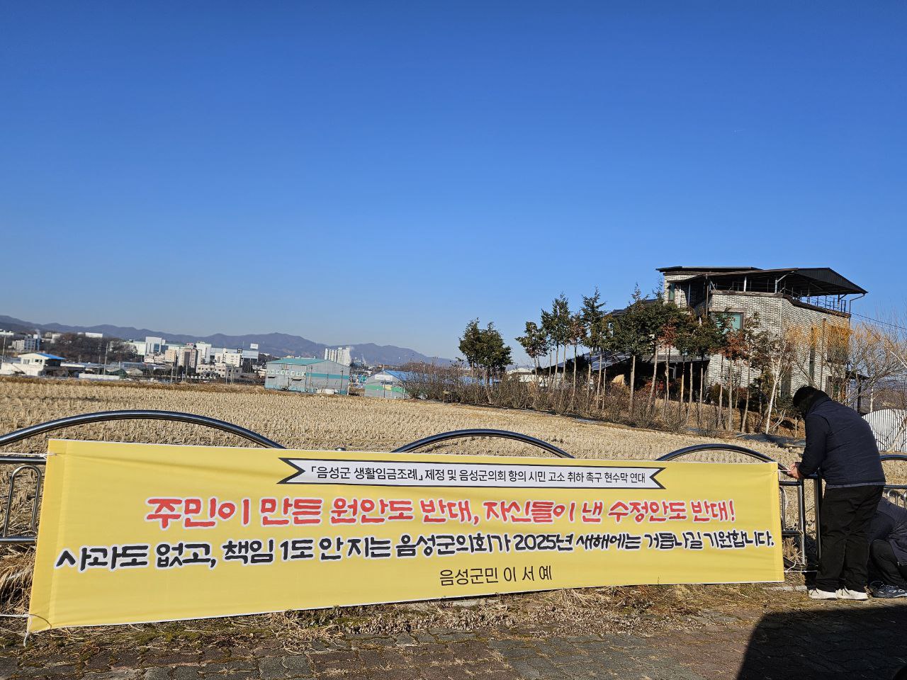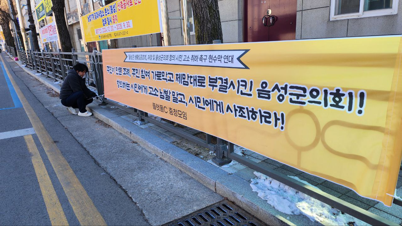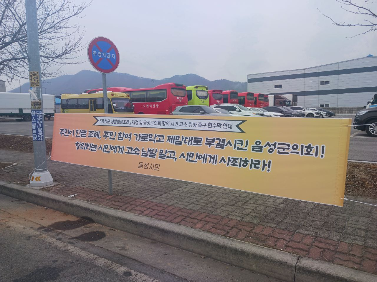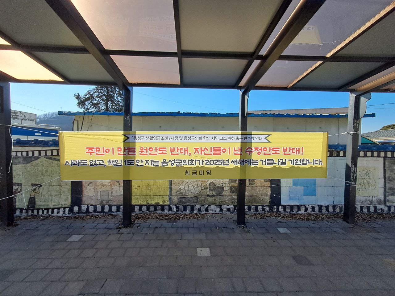 음성군 생활임금조례안를 부결시킨 음성군의회를 규탄하기 위해 2024년 12월 26일부터 2025년 1월 1일까지 규탄 현수막 연대 신청을 받았습니다. 그러자 전국에서 수많은 분들이 음성군의 풀뿌리 민주주의를 지키기 위한 손길을 건네주셨습니다.