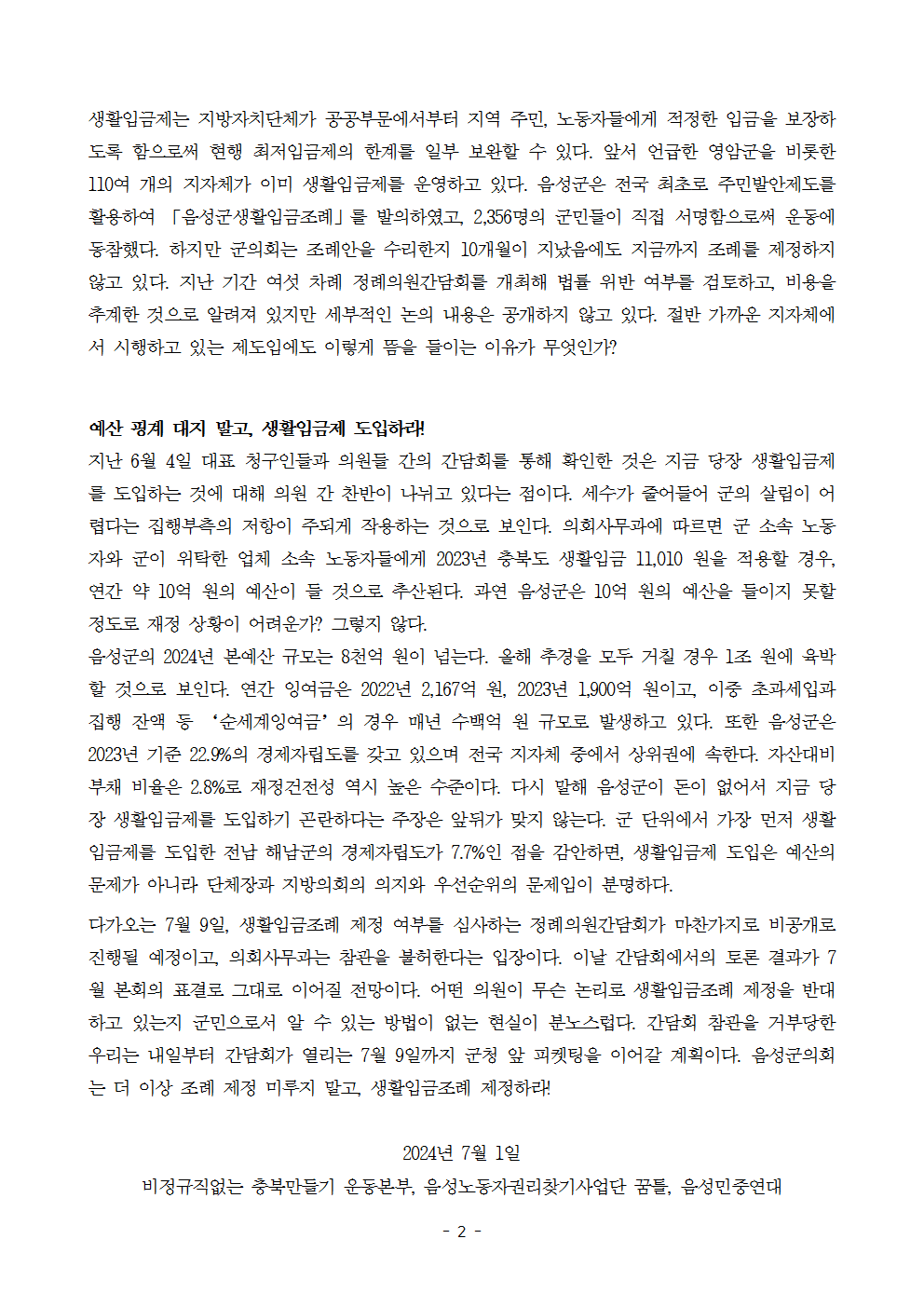 | [사후 보도자료] 음성군 생활임금조례 부결 사태 항의 방문 및 음성군의회 규탄 기자회견 (0) | 2024.07.23 |