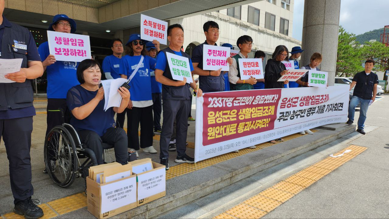 | 2,337명 군민이 응답했다! 음성군은 생활임금조례 원안대로 통과시켜라! 음성군 생활임금조례 주민 청구인 명부 제출 기자회견 |