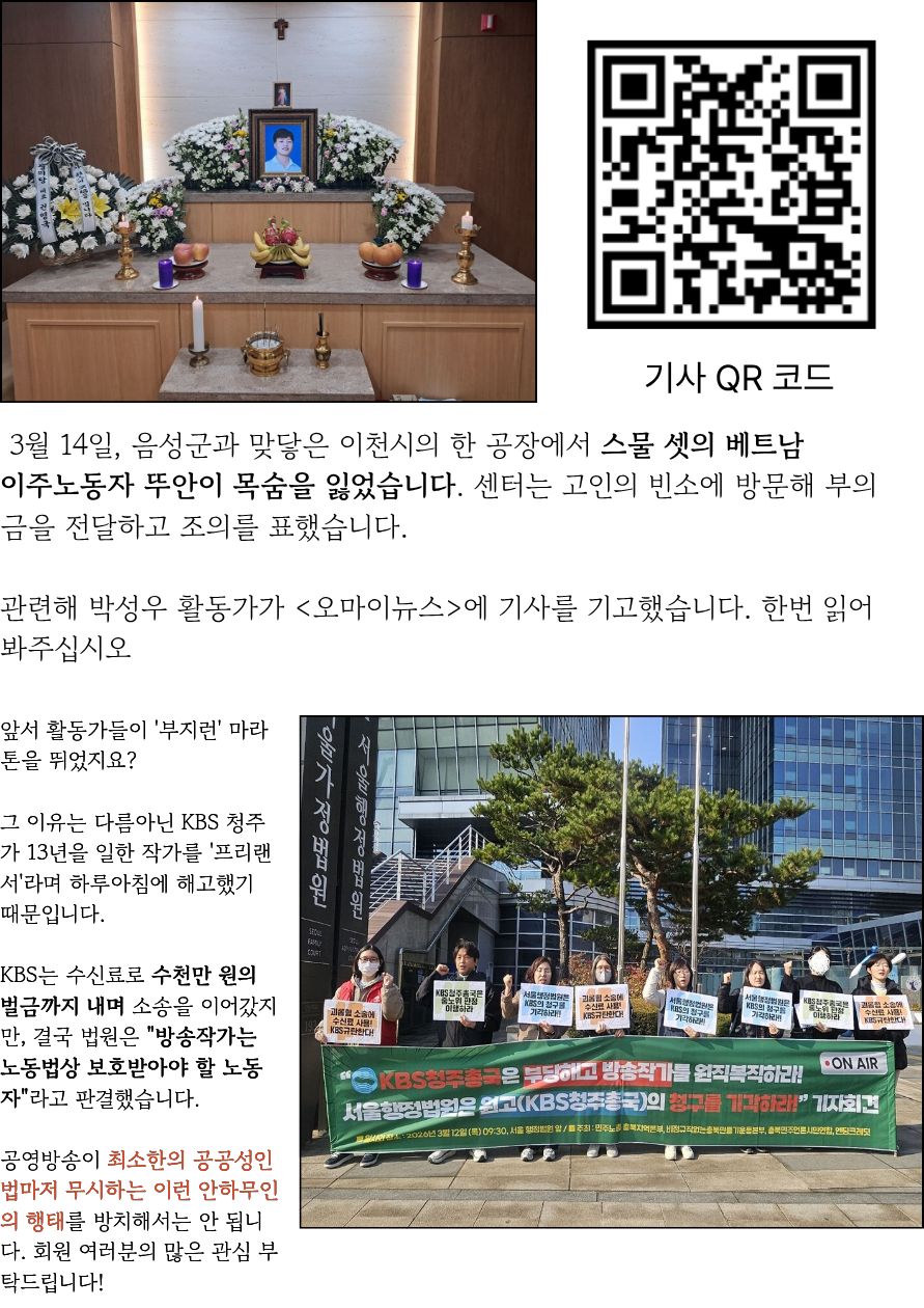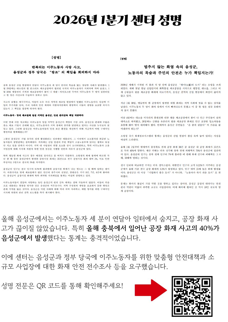 | [성명] 반복되는 이주노동자 사망 사고, 음성군과 정부 당국은 ‘방조’의 책임을 회피하지 마라 (0) | 2026.02.04 |