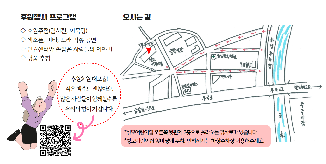 오직 노동자, 시민의 힘으로 운영되고 있는 인권센터가 계속해서 활동을 이어갈 수 있도록 인권센터의 손을 잡아주시길 부탁드립니다. 손잡고 함께 더 멀리 걸어가길 기대합니다!
