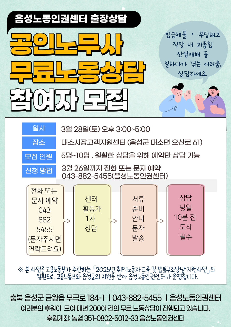 센터는 오는 3월 28일(토) 오후 3시부터 5시까지 대소시장 고객지원센터(음성군 대소면 오산로 61)에서 김선애 공인노무사와 함께 출장 노동상담을 운영한다고 밝혔다.