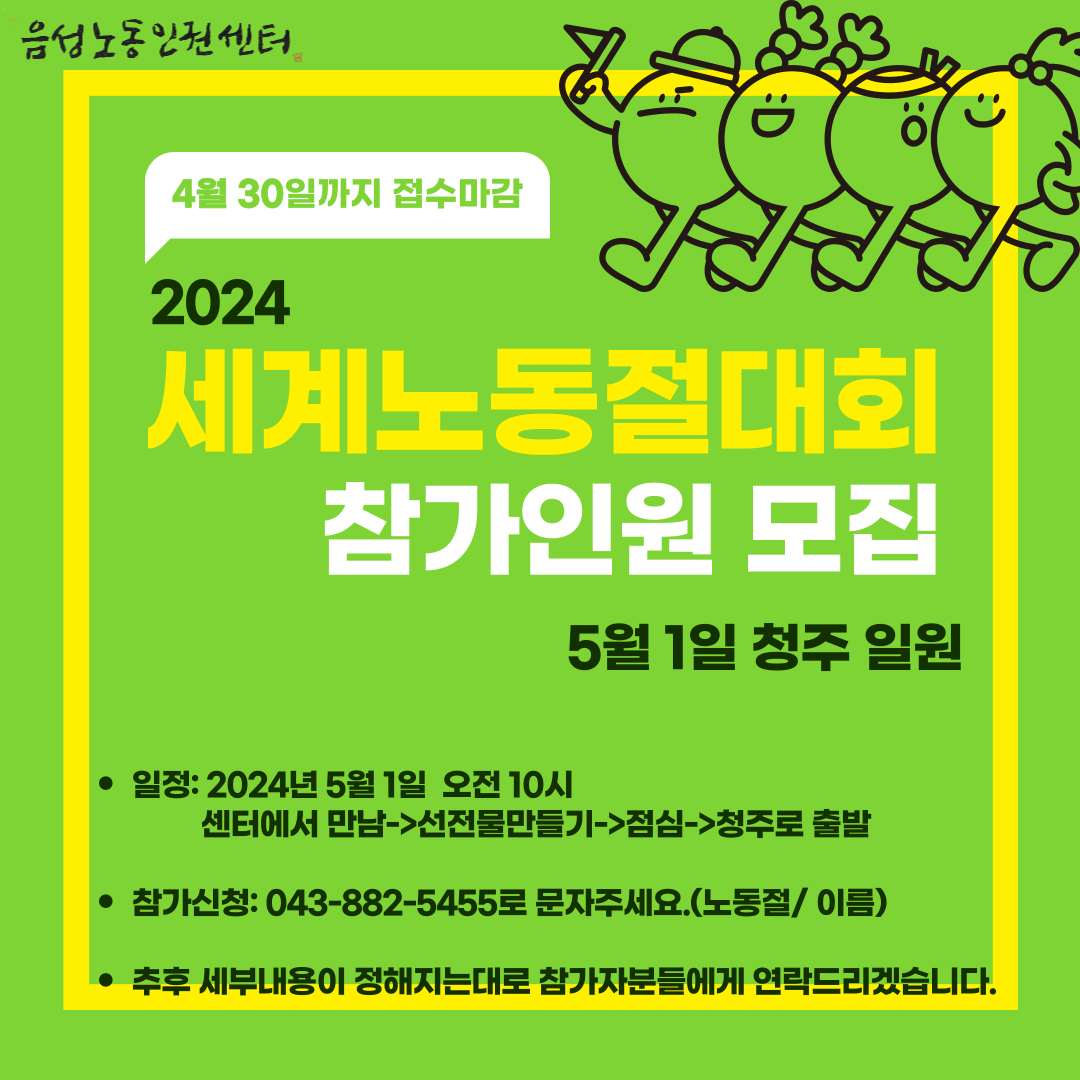 ‘만국의 노동자여 단결하라’ 노동절은 전 세계 노동자들의 연대와 단결을 과시하는 날입니다. 2024년 노동절이 청주에서도 열리게 되어 회원님과 함께 가려고 합니다. 함께 가실 분들 누구나 연락주세요!! 단체모자 증정!!