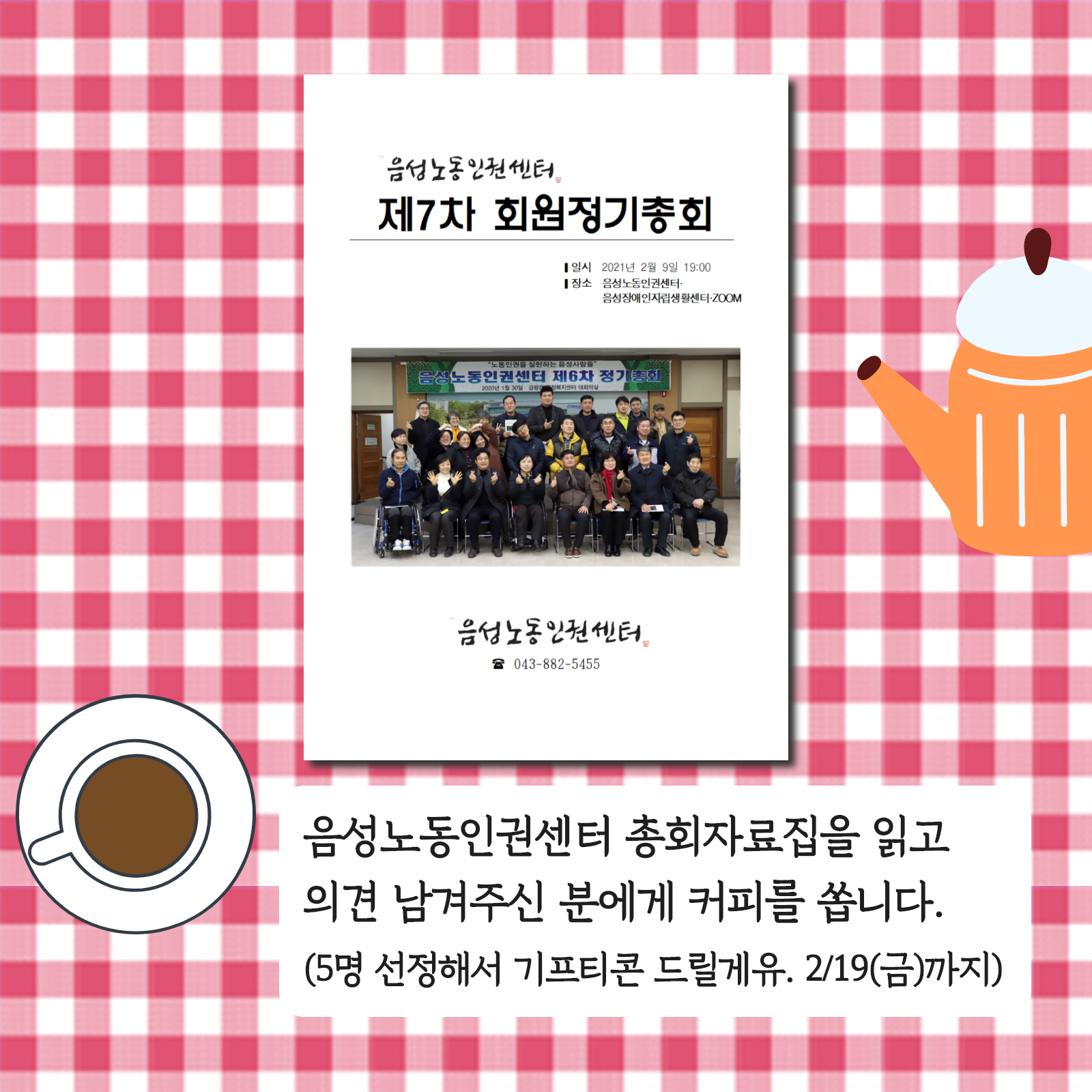 지난주 음성노동인권센터는 제7차 회원정기총회를 진행했습니다. 상담활동을 비롯한 지난 활동들을 정리하고 앞으로의 계획을 나누는 자리였습니다. 자료집 내용이 궁금하신 분들, 자료집과 센터 활동에 의견 남기실 분들은 자료집 신청하고 의견 남겨주세요! 센터 활동에 큰 힘이 됩니다.^^