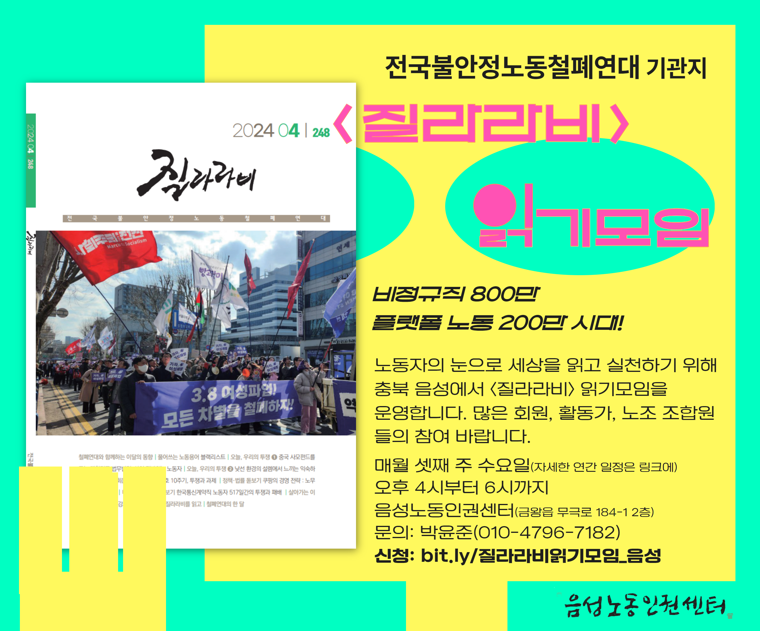 비정규ㆍ불안정 노동자의 눈으로 세상을 보여주는 월간 <질라라비>를 읽고, 지역에서의 실천을 찾는 모임을 준비했습니다. 매월 네번째 수요일 오후 4시 음성노동인권센터 사무실에서 모입니다. 많은 분들의 신청 바랍니다!