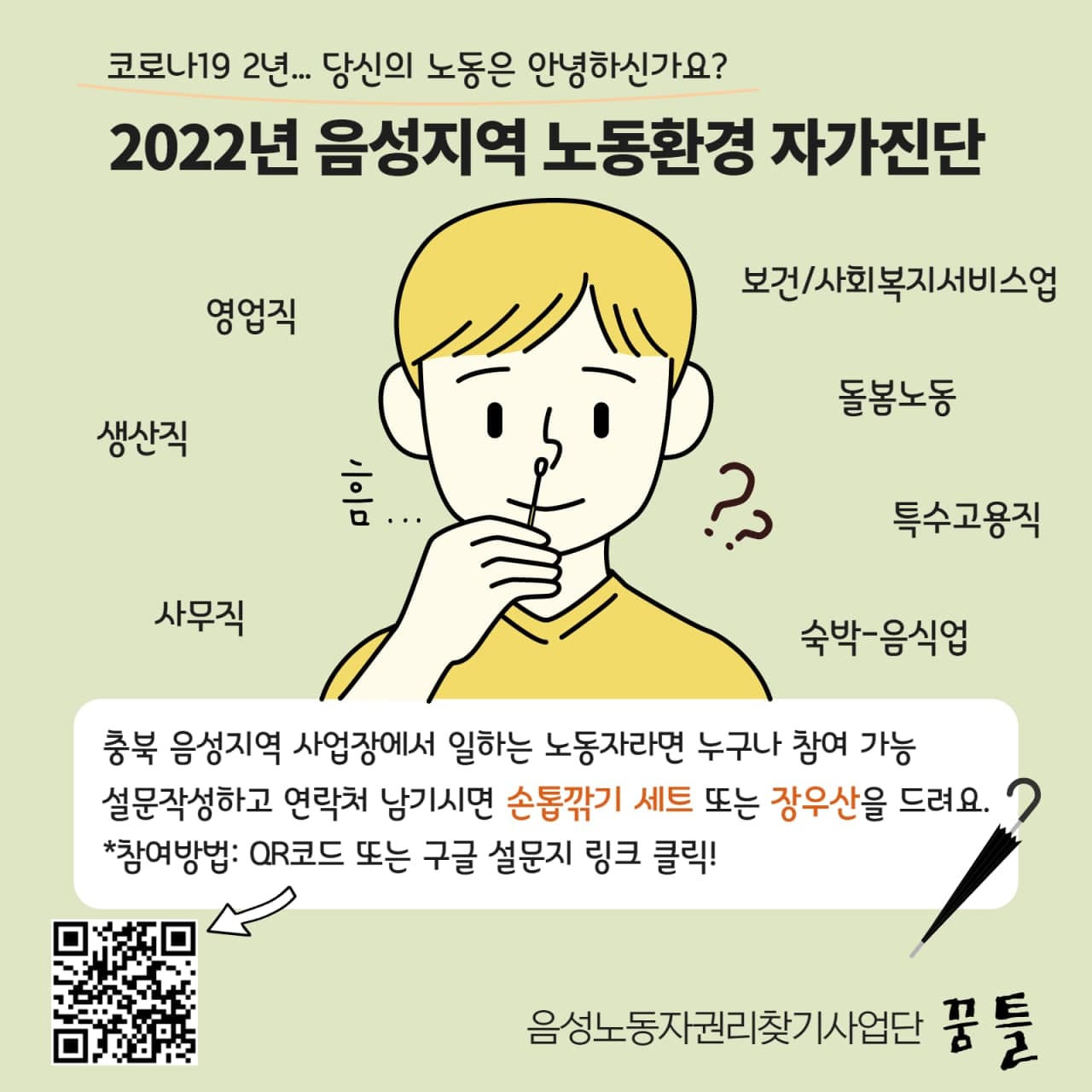 본 설문조사는 음성지역에서 일하고 있는 작은 사업장 노동자들의 애로사항을 파악하고 일자리 개선을 위한 정책 수요를 파악하기 위해 실시하는 조사입니다. 바쁘시더라도 시간을 내서 조사에 참여해주시면 감사하겠습니다. 본 조사 결과는 「통계법」 제33조(비밀의 보호)에 의해 철저하게 비밀이 보장됩니다. 설문결과는 통계/연구 자료로만 사용되며, 개인정보는 외부로 유출되지 않습니다. 감사합니다.