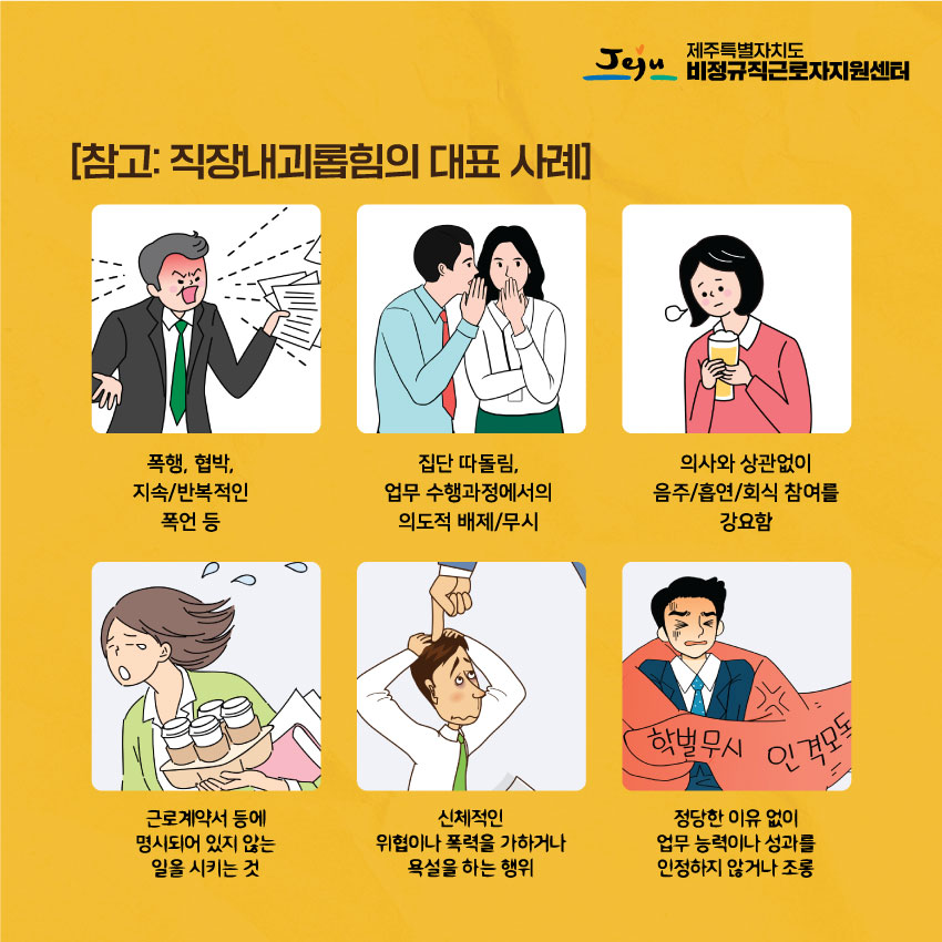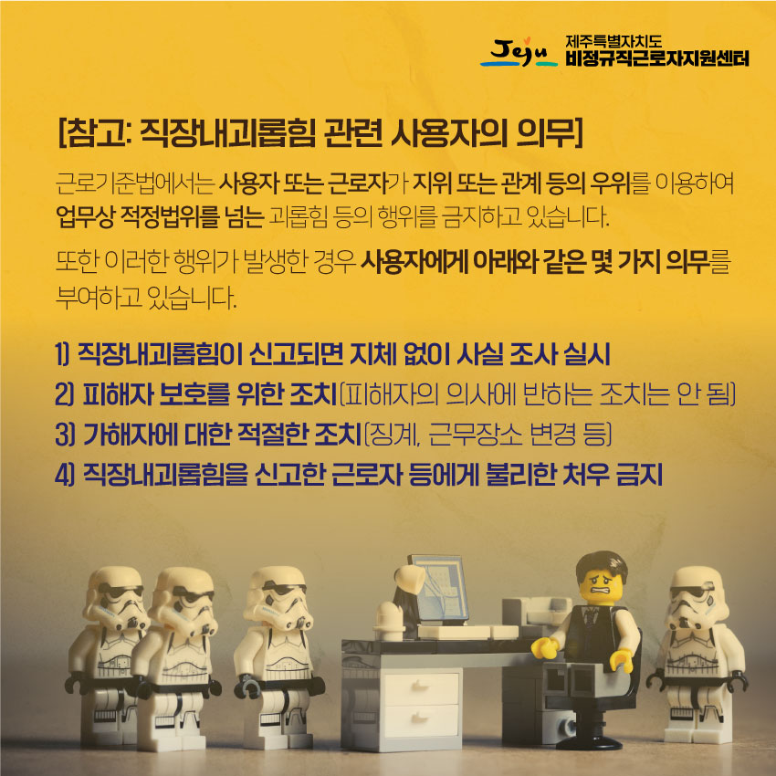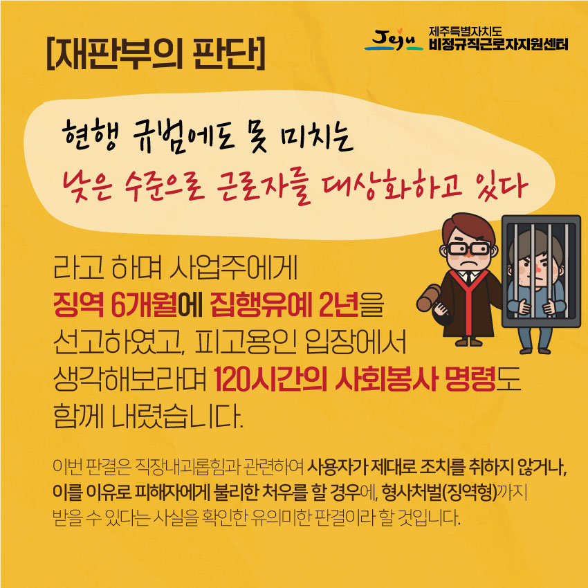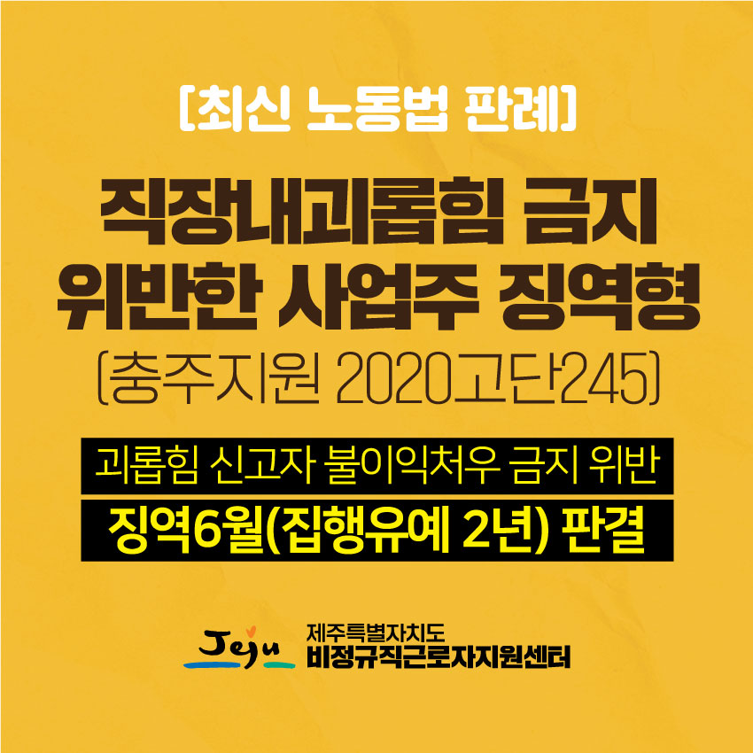 음성노동인권센터에서 법률 지원한 '직장 내 괴롭힘 신고자 불이익 처분 사업주 고발' 사건이 국내 1호 사업주 실형 선고 판례를 남겼습니다. 제주특별자치도 비정규직근로지지원센터에서 "직장내괴롭힘금지 위반 사업주 징역형" 판례를 카드뉴스로 만들었습니다.