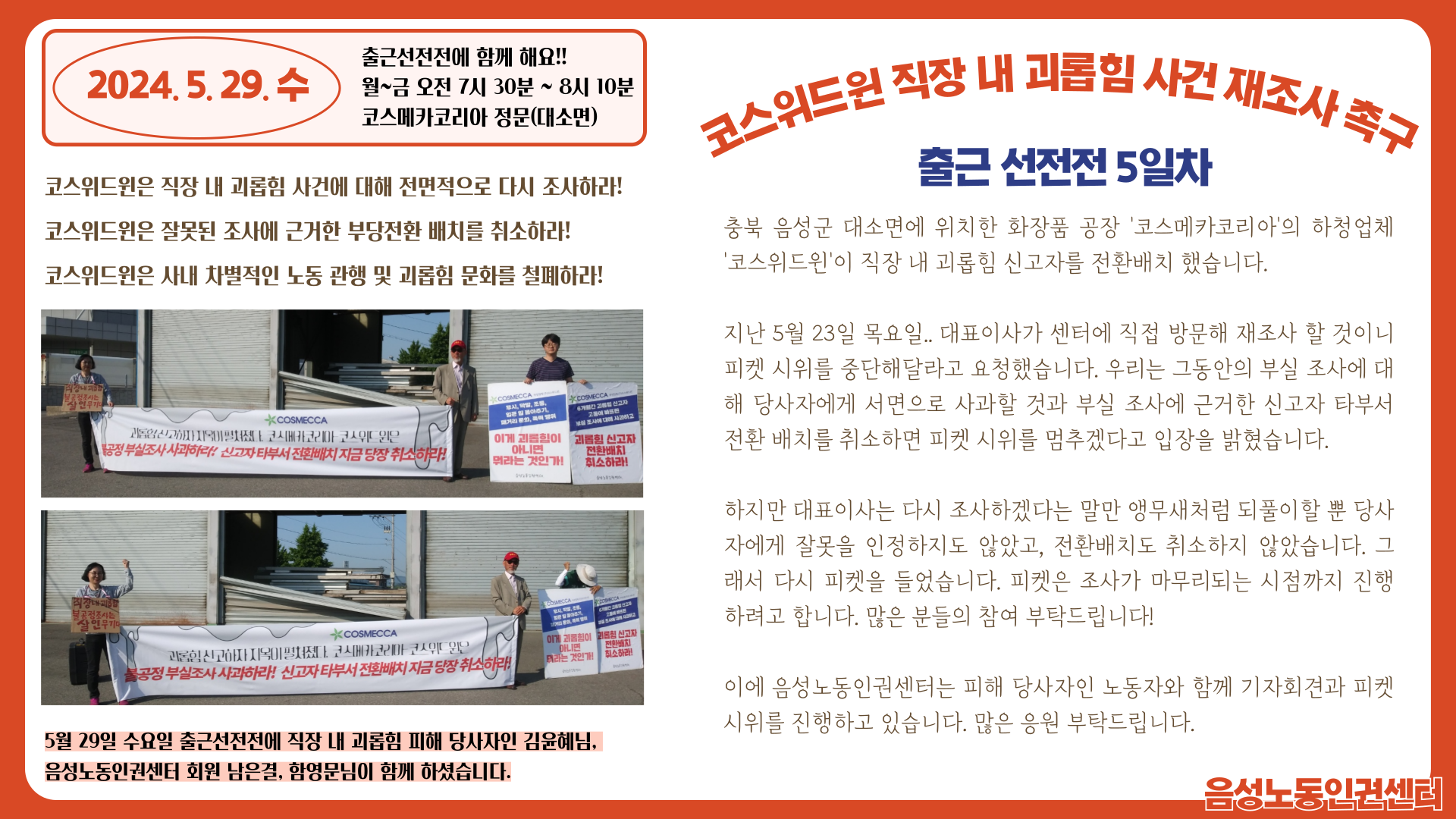 | 코스위드윈 직장 내 괴롭힘 사건 재조사 촉구 출근선전전 6일차 (0) | 2024.05.31 |