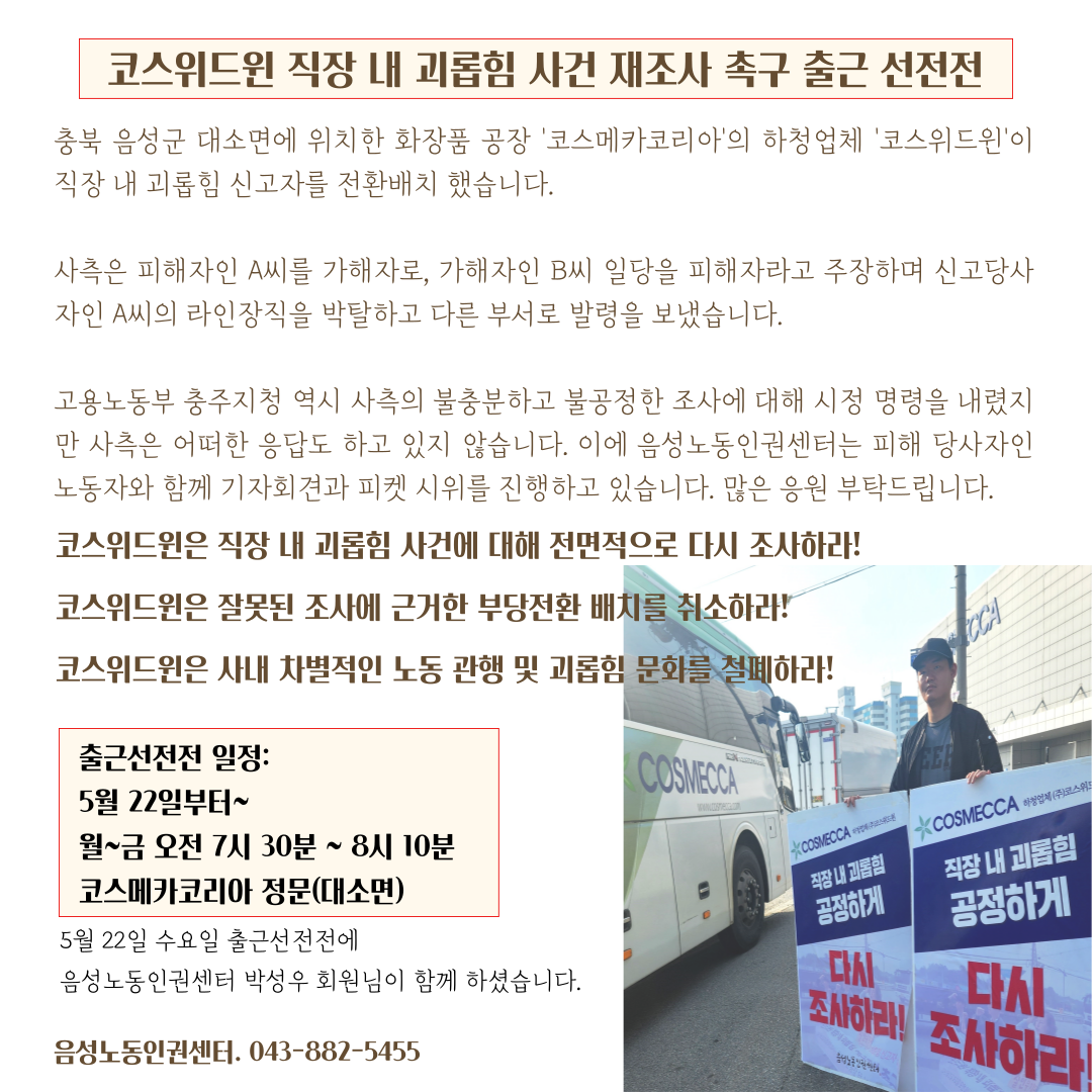 | 코스위드윈 직장 내 괴롭힌 사건 재조사 촉구 출근선전전 5일차 (0) | 2024.05.29 |