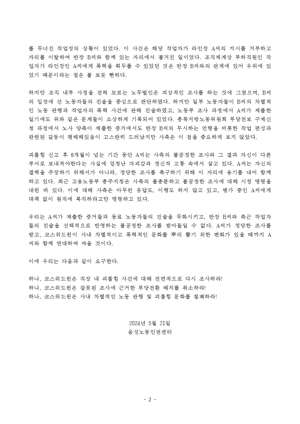 | [충북지역 노동인권단체 공동 성명] 우리는 성희롱 피해자가 일터에 안전하게 복귀하는 세상을 원한다(2024.4.18.) (2) | 2024.04.18 |