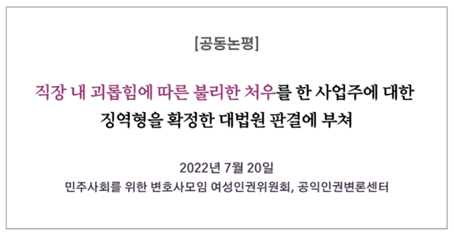 [공동논평] 직장 내 괴롭힘에 따른 불리한 처우를 한 사업주에 대한 징역형을 확정한 대법원 … 더보기