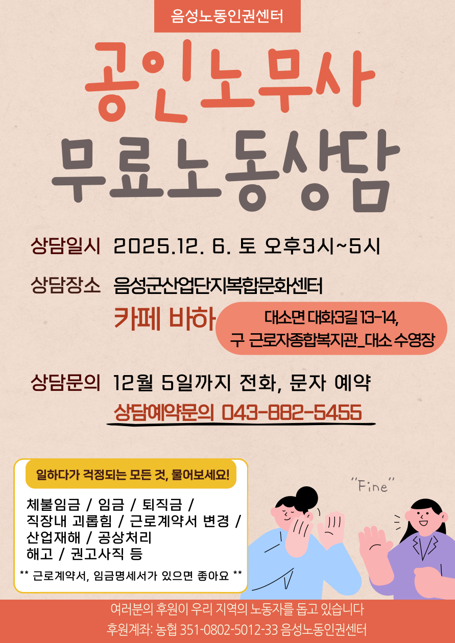 | 음성노동인권센터, ‘취약노동자 지원사업 우수사례’ 장관 표창 수상 (0) | 2025.12.17 |