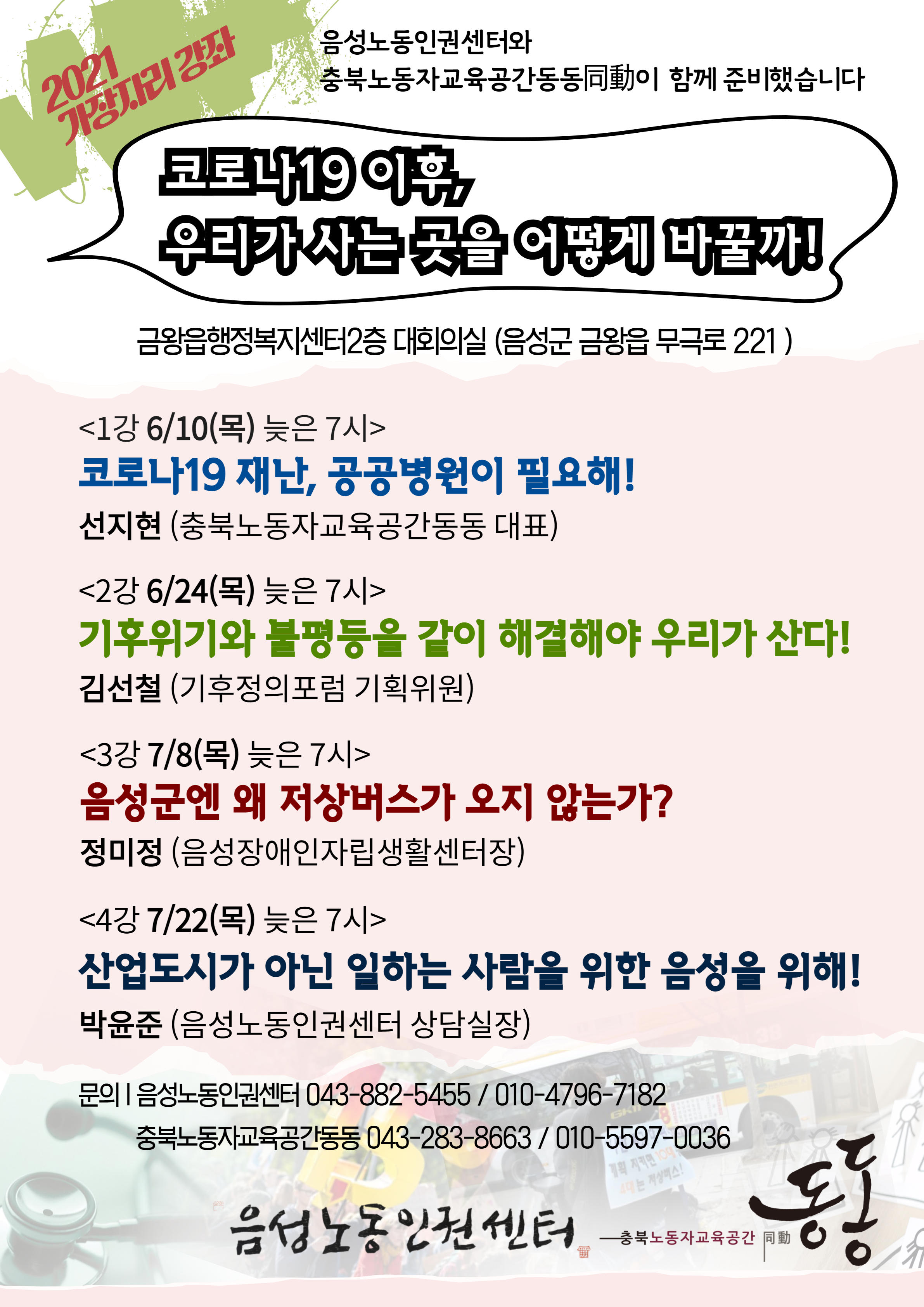 반갑게도 '충북노동자교육공간 동동'에서 먼저 제안을 해주셔서 어렵지 않게 강좌를 준비할 수 있었습니다. 공공병원, 기후위기, 장애인 이동권, 도시권 등의 다양한 주제를 통해 우리 지역의 삶을 뒤돌아보면 좋겠습니다.