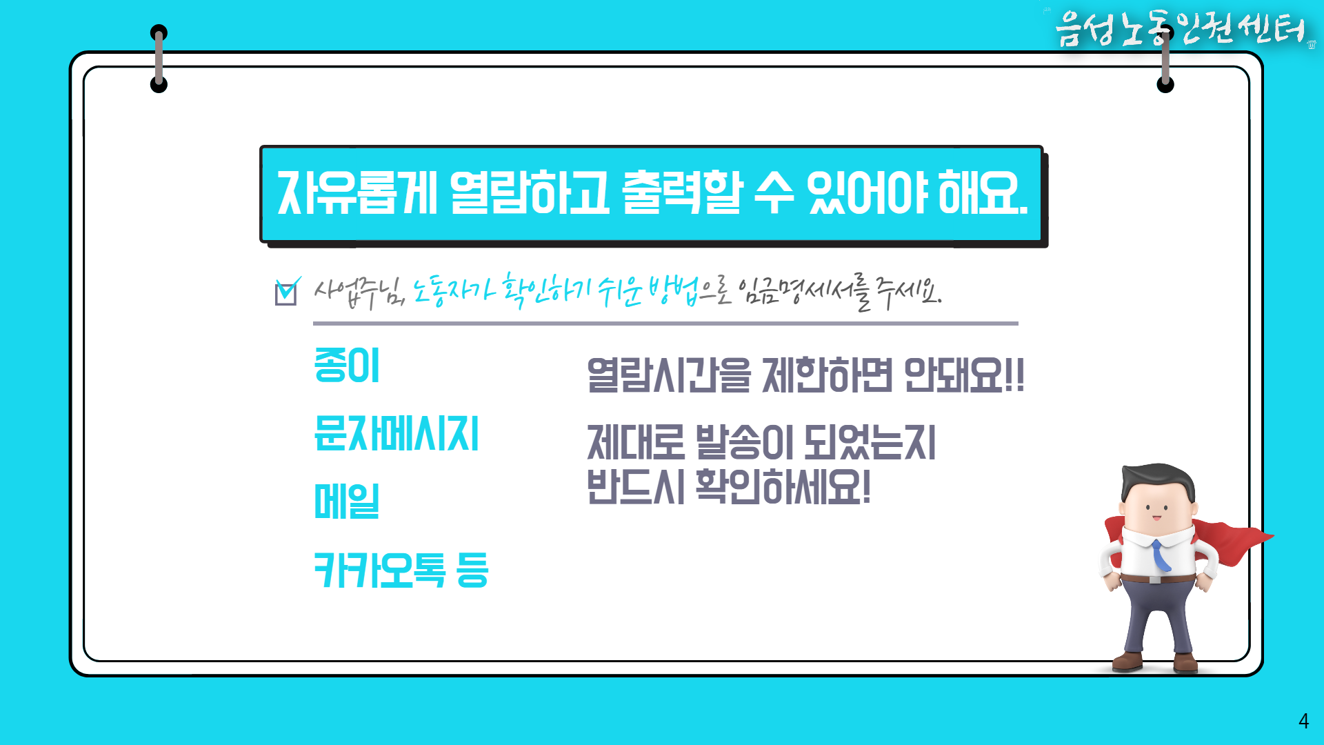 상담 및 법률지원/월간노동상담, 카드뉴스 사장님이 알아야 손해보지 않는 근로기준법- 5. 임금명세서는 꼭 주세요! 음성노동인권센터 2022. 4. 26. 11:01 저작자표시 비영리 (새창열림)