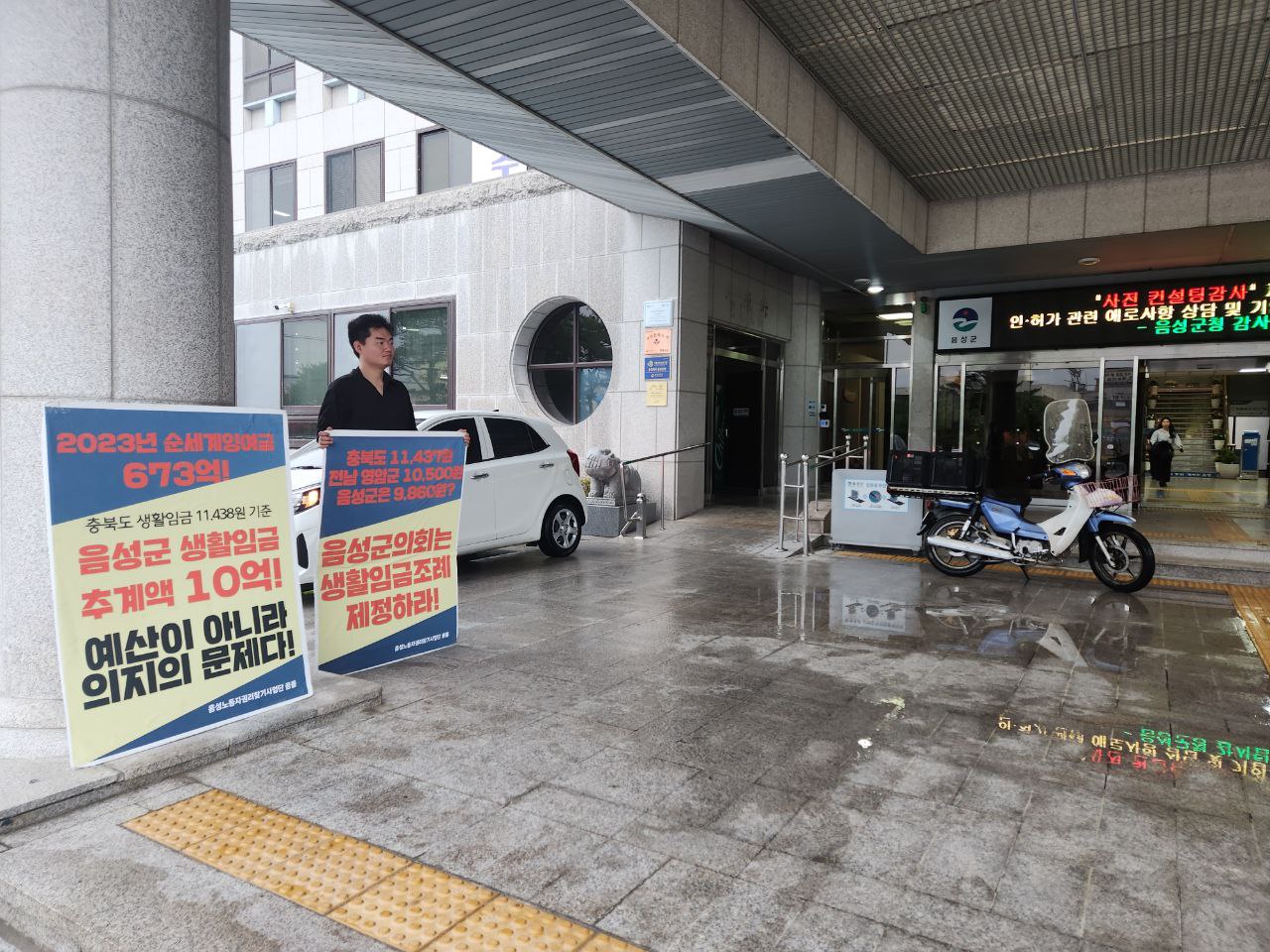 오늘 오전 11시 50분터 음성군청 앞에서 음성군의회의 생활임금조례 제정 촉구 피켓팅 활동에 천윤미 홍보차장, 박성우 상임활동가가 나섰습니다.
