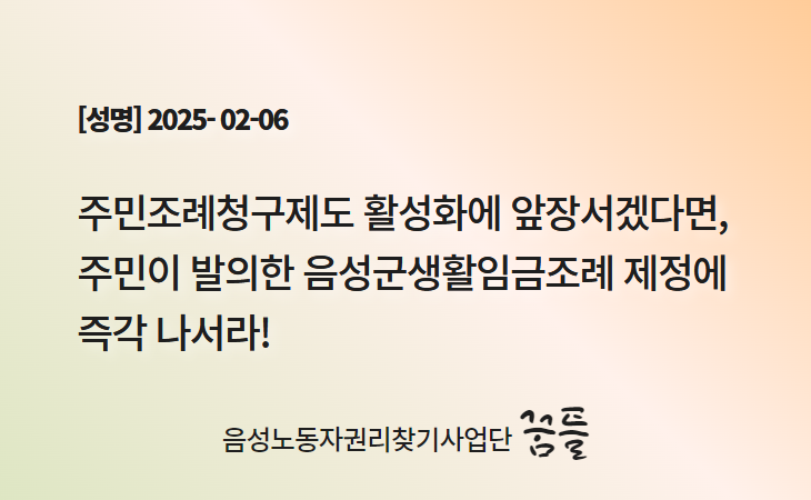 [꿈틀 성명] 주민조례청구제도 활성화에 앞장서겠다면, 주민이 발의한 음성군생활임금조례 제정에 즉각 나서라!