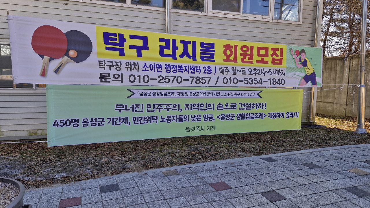 2025년 1월 10일, 음성노동인권센터는 회원분들 및 음성노동자권리찾기사업단 꿈틀과 함께 음성군 전역에 현수막을 달았습니다. 연대를 보내주신 분들께 감사의 말씀을 올립니다.