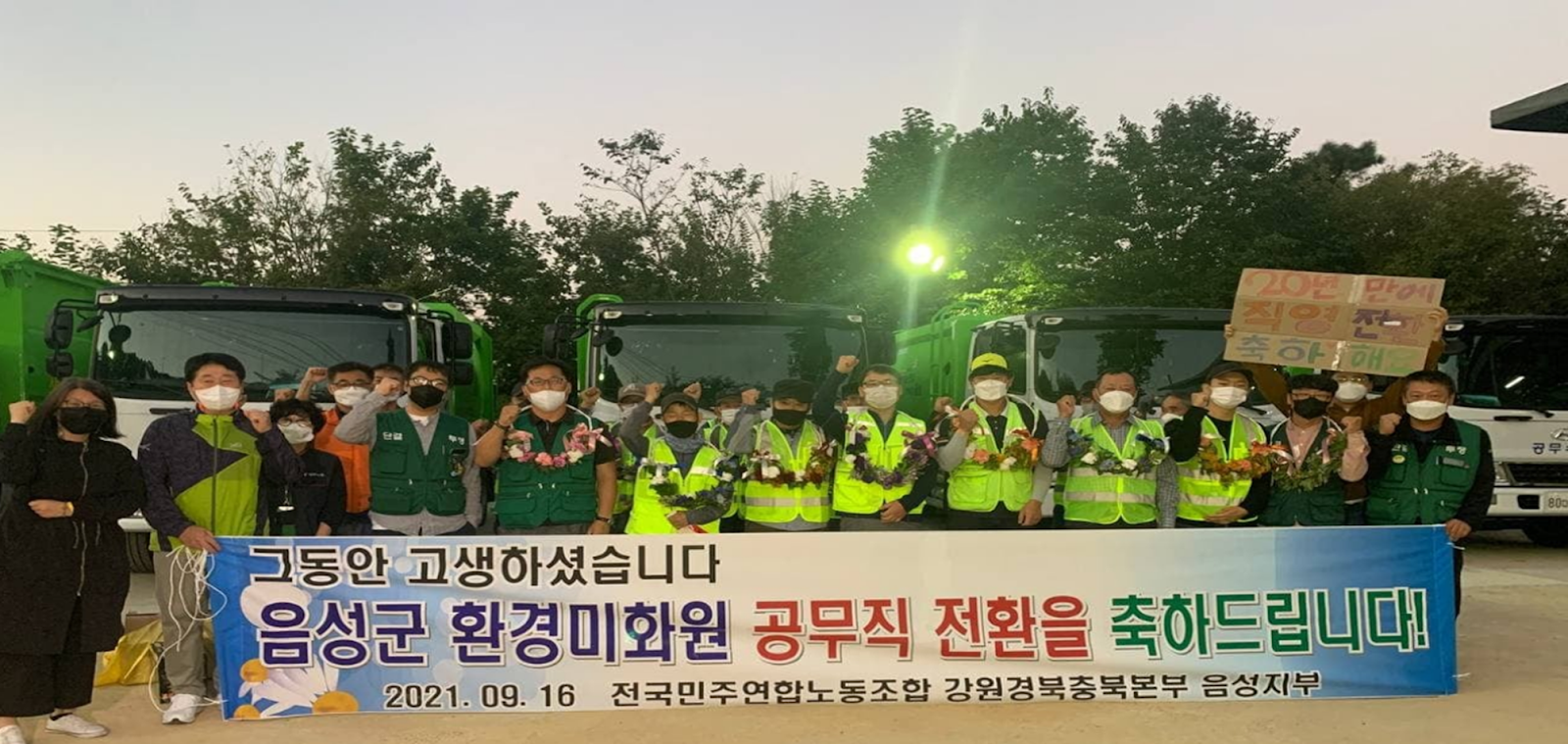 조병옥 군수는 6월 10일 긴급 브리핑을 통해 문화환경에 대해 계약 해지를 통보할 것과 정규직 전환을 위한 심층논의기구를 구성할 계획할 것임을 밝혔습니다. 문화환경 노동자들이 음성군에 직고용된 공무직으로서 일할 수 있게 된 것입니다. 정규직 전환시 급여 및 정년 문제에 관한 줄다리기 교섭이 있었지만, 노동조합 측이 군의 제안을 전격 수용하기로 결정하면서 노동자들은 9월부터 음성군 소속으로서 첫 출근을 할 수 있었습니다. 군이 생활폐기물 수집운반업무를 민간 업체에게 위탁을 준 지 20여년 만의 첫번째 직고용 쟁취였습니다. 시간이 흘러, 보조금을 횡령하였던 문화환경 사업주는 지난 2024년 11월 징역 4년에 법정 구속되었습니다. 조 군수가 약속했던 심층논의기구는 현재 가동되지 않고 있습니다. 민간위탁의 직영 전환, 생활폐기물수집운반 부문에서부터 제대로 실현되어야 할 것입니다.