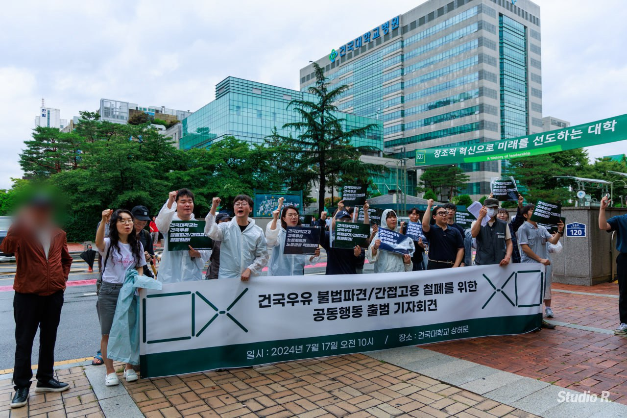 센터에서는 건국우유 불법파견 사건을 만나면서 2017년 지역 사회와 산업계에 제기하였던 간접고용 문제가 지난 7년 동안 개선되지 않은 현실을 보았습니다. 경기에 따라 정도는 달라지지만, 직업소개소는 꾸준히 성행하고 있고, 어느덧 100여개의 직업소개소(무등록 포함)들이 영업을 벌이고 있었습니다. 간접고용과 불법파견은 음성 지역의 문제임과 동시에 전국의 제조업체 내에 상존하고 있는 구조적, 제도적인 문제였습니다. 센터는 건국우유 불법파견, 간접고용의 문제를 더욱 확산시키고, 이를 개선할 수 있는 사회적 힘을 모아내자는 뜻을 모았습니다. 건국우유의 수익금 전액이 건국대학교 학생 장학금으로 쓰인다는 사실에 착안하여 이 문제에 공감하고 함께 행동할 수 있는 건국대학교 내 학생 주체들을 수소문하였습니다. 학생사회주의자연대의 주선으로 서울지역 인권연합동아리 건대지부와 서울 페미니스트 대학생 연합동아리 동부지부의 건국대 학생 회원들을 만나게 되었습니다. 전국대학교수노동조합과 전국불안정노동철폐연대도 인권센터와 뜻을 함께 해주었습니다. 우리는 “건국대학교는 건국우유 불법파견/간접고용 철폐하고, 건국우유 내 모든 노동자의 노동법상 권리 보장하라!”는 구호 아래 <건국우유 불법파견/간접고용 철폐를 위한 공동행동>을 지난 2024년 7월 출범시켰습니다. 이날의 행동에 서울지역 사회운동단체들이 연대하고, 각 단체의 소식지, 홈페이지, 유튜브 등 다양한 매체에 이 사안을 다뤄주었습니다. 음성지역과 서울지역 간의 연대, 현장 노동자와 학생 주체들간의 연대가 빛을 발하는 순간이었습니다. 또한 한국일보 등 주요 일간지 및 언론 매체에 건국우유 불법파견, 간접고용의 문제점이 소개되면서 전국적인 관심을 받기도 하였습니다.