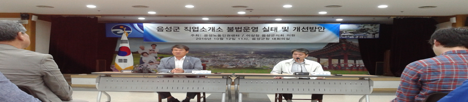 2016년 10월, 노동인권센터와 이상정 군의원이 <음성군 직업소개소 불법운영 실태 및 개선방안> 토론회를 공동 주최하였습니다. 음성지역에서 만성화되어 있는 직업소개소의 불법적인 운영 실태를 지역사회에 폭로한 ‘사건’이었습니다. 노동인권센터는 상당수의 직업소개소들이 당시 법정 소개요금의 범위인 임금의 4% 이하를 훨씬 넘어선 임금의 10~20% 이상을 일용직노동자들로부터 징수하고 있는 실태를 발표했습니다. 이날 토론회에서는 음성군의 관리 감독을 강화하고, 사업주 대상 교육이 필요하다는 개선 방안이 나왔습니다.