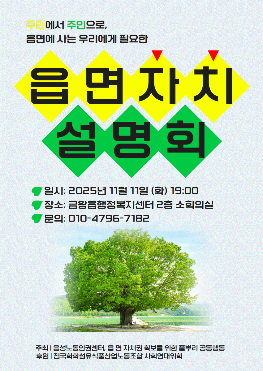 읍면자치권 확보를 위한 풀뿌리 공동행동의 찾아가는 읍면자치 설명회를 아래와 같이 개최합니다. 관심 있는 지역 주민들의 많은 참여 바랍니다. (별도 신청 없이 참석 가능합니다.)