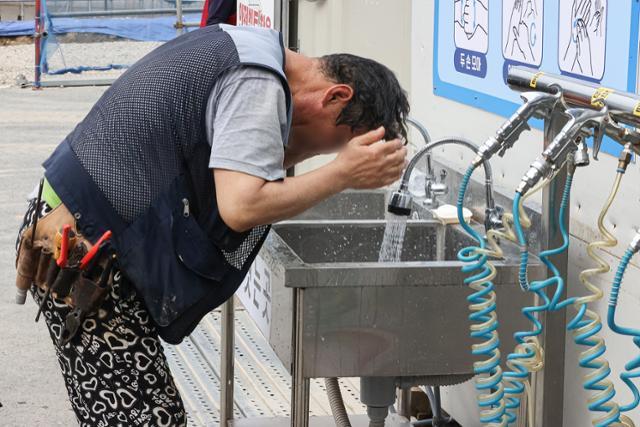 서울 한낮 기온이 30도를 넘긴 지난 20일 오후 건설노동자가 서울 강동구 한 건설현장에서 찬물로 머리를 감고 있다. 건설 일용노동은 대표적으로 직업소개소를 거쳐 일감을 얻는 직종이다. 사진은 기사와 관련 없음. 연합뉴스