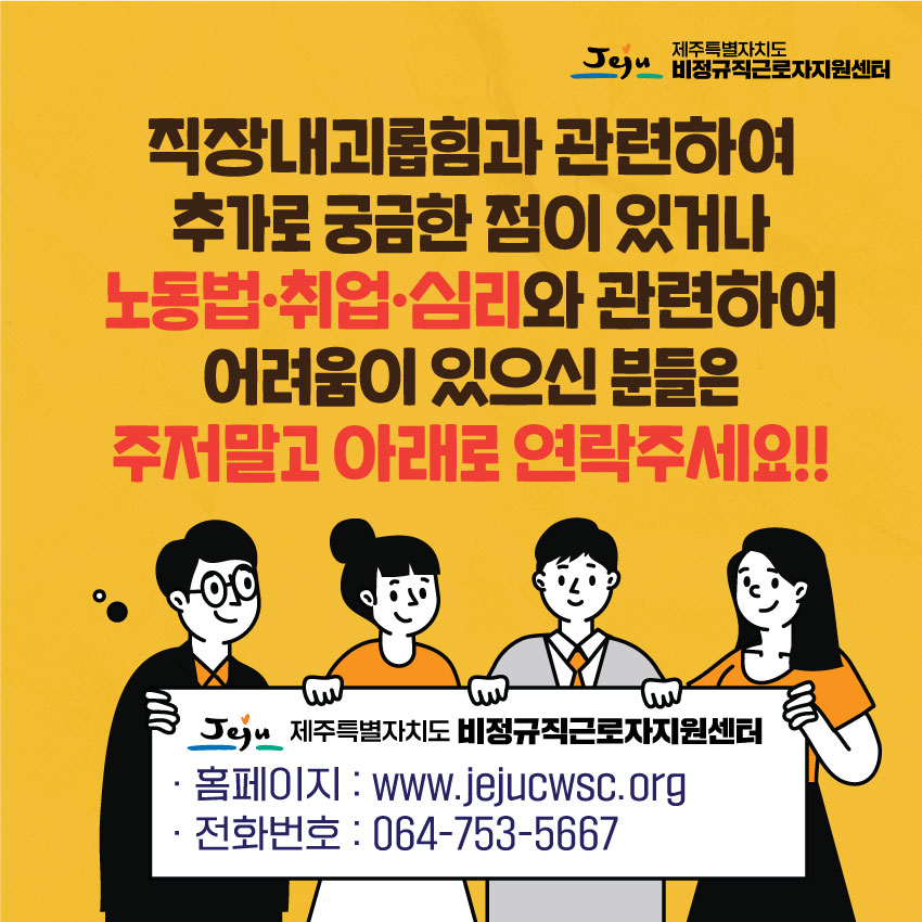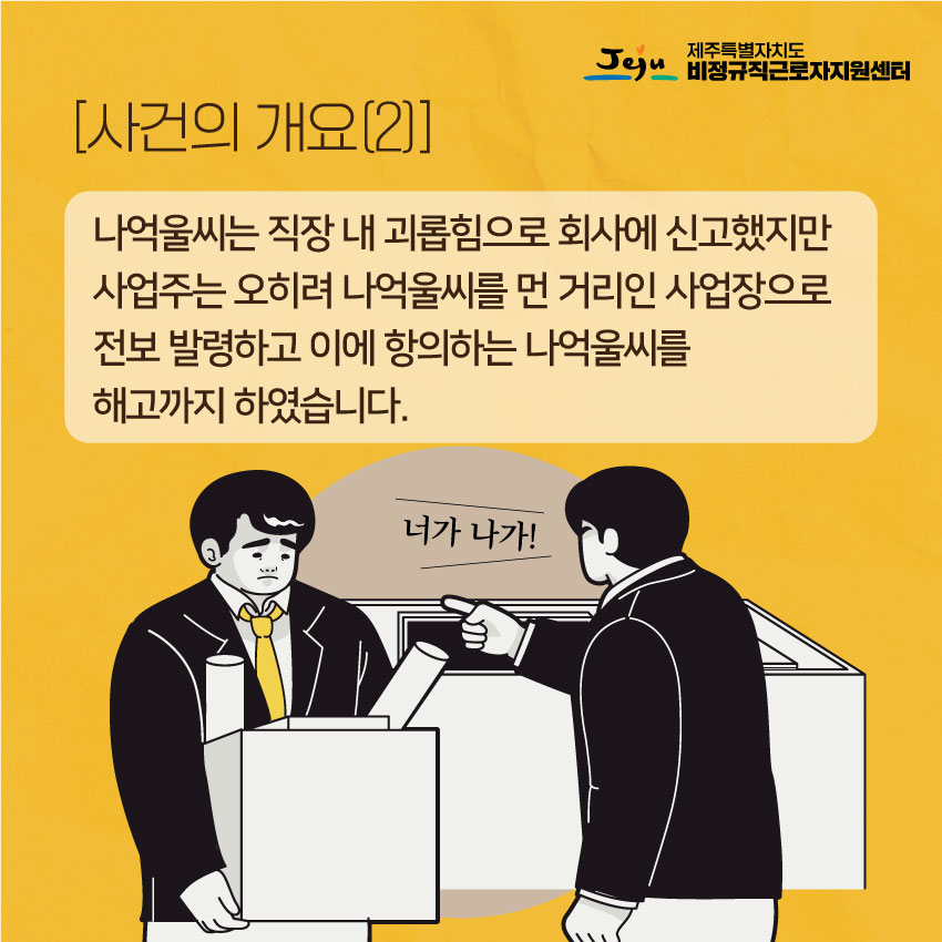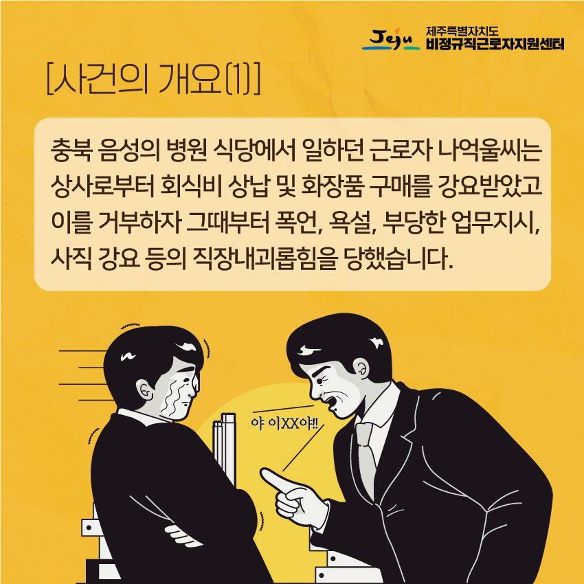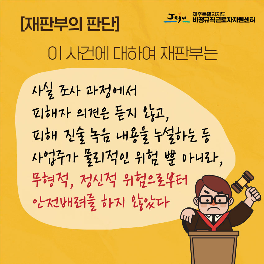 음성노동인권센터에서 법률 지원한 '직장 내 괴롭힘 신고자 불이익 처분 사업주 고발' 사건이 국내 1호 사업주 실형 선고 판례를 남겼습니다. 제주특별자치도 비정규직근로지지원센터에서 "직장내괴롭힘금지 위반 사업주 징역형" 판례를 카드뉴스로 만들었습니다.